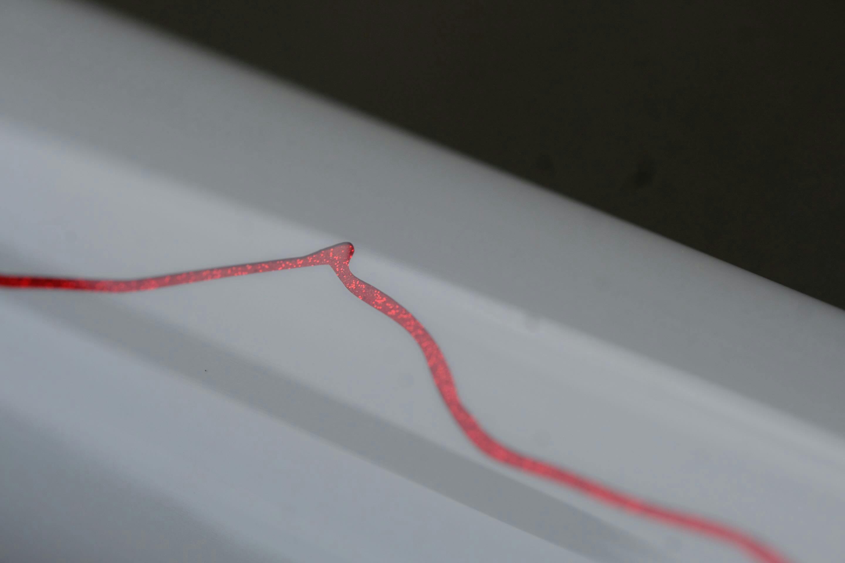 The paint finish is done with discretion : the chalk gray used as a base is enhanced with red logos. A line representing the profile of the "Chaine des Puys" was create to remind Bertrand of his native region - and also Victoire's. This line is made in metallic red with red glitter referring to the lava that forged these mountains. In the sunlight the glitter will draw the attention to this discreet detail.