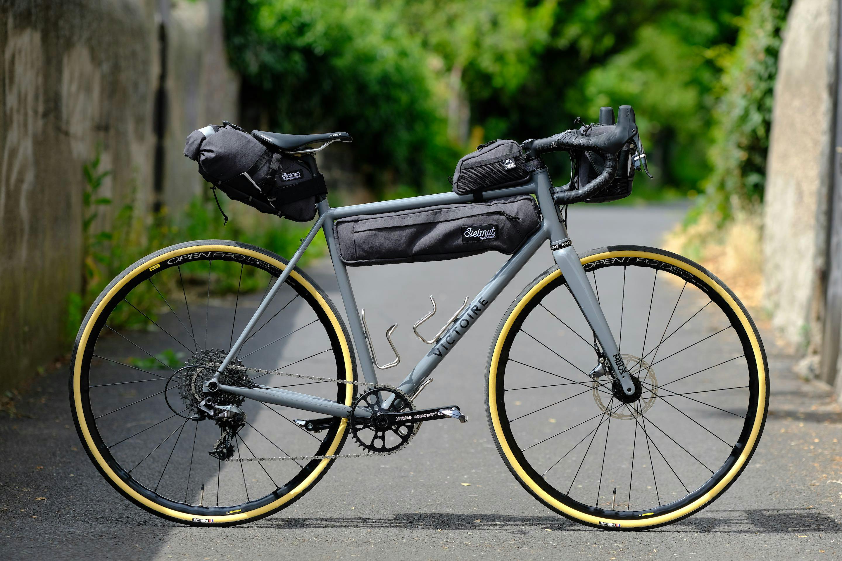 Alain's bike follows the codes of a classic, sporty road bike, but its geometry favors comfort for long distance. We have also added to this hybrid bike some load capacity for light touring: The Helmut luggage set (handcrafted in France by our friend Rodolphe Pasciuto) is attached to the frame and components.