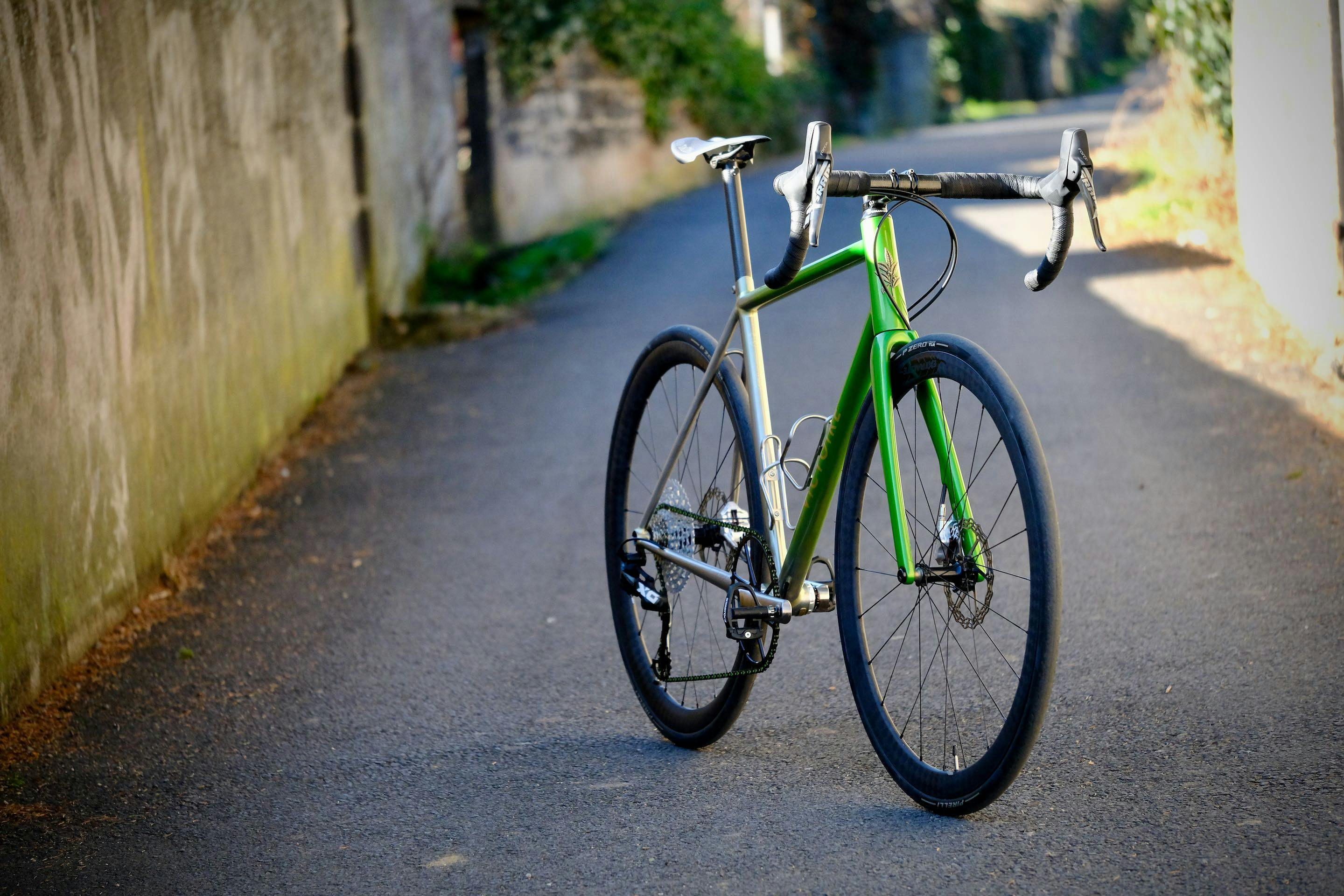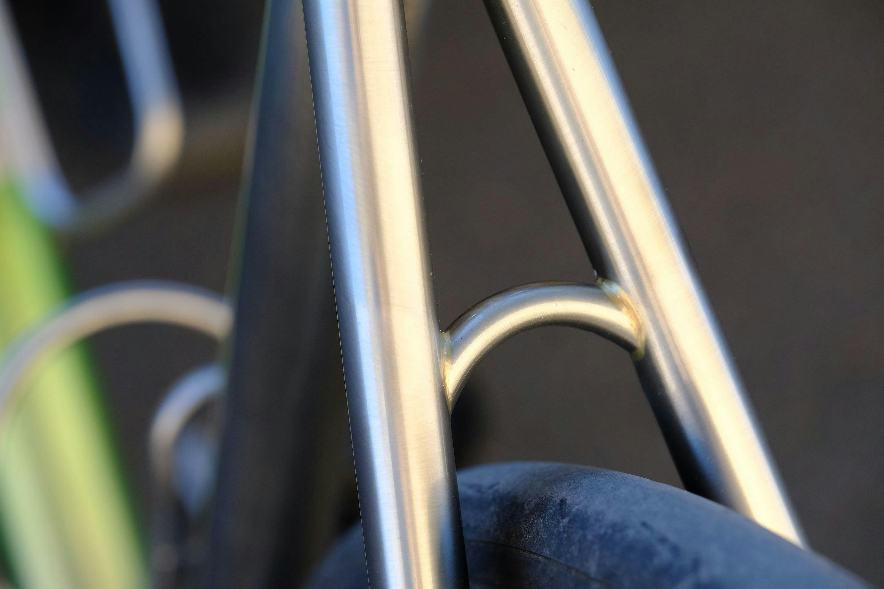 The paintwork of the Victoire n°503 consists of two metallic colours. The first is an anise green that covers the front of the bike as well as the ENVE fork. The back of the frame reveals the stainless steel as well as the welding work made in the workshop using a transparent clear coat.