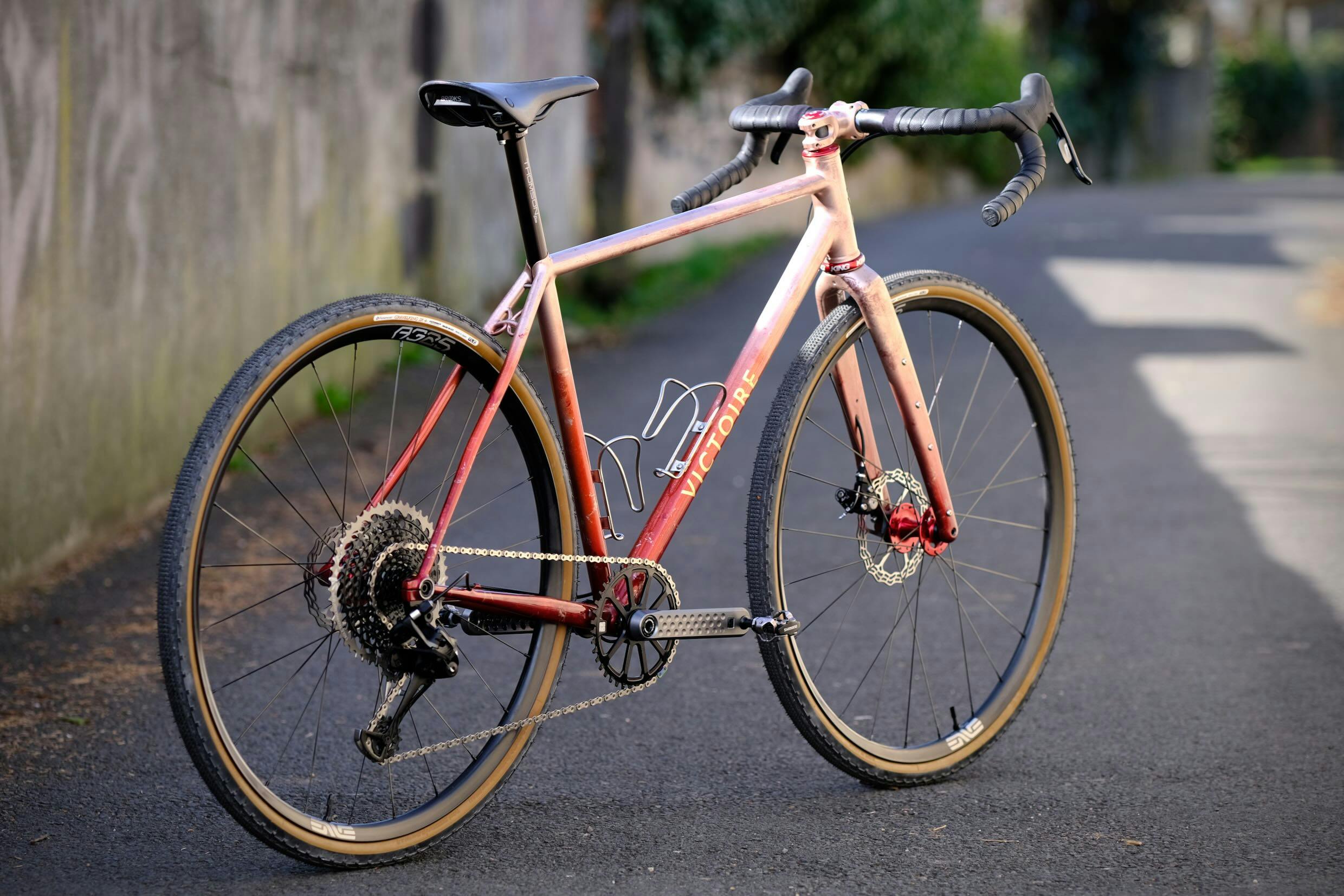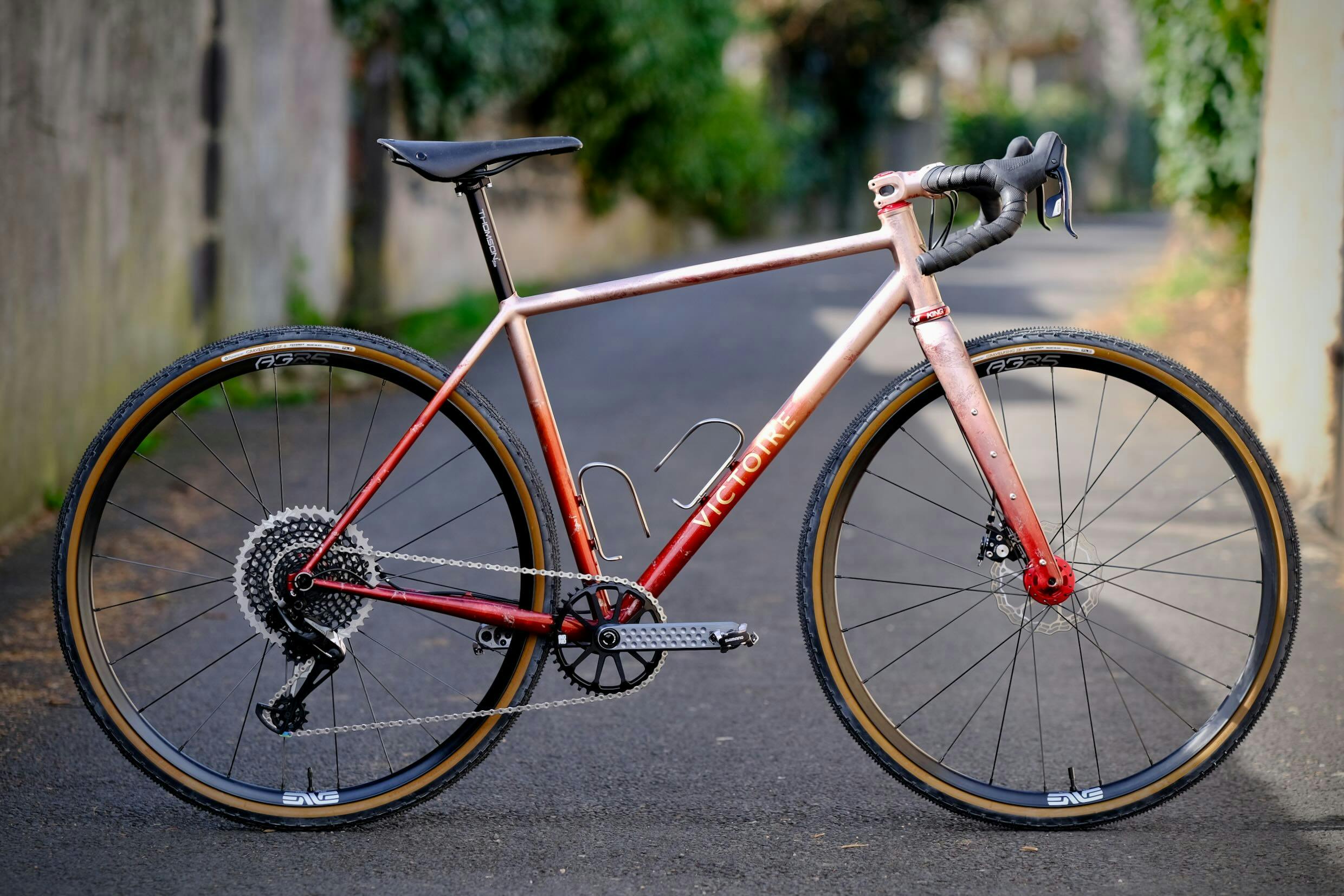 This is my third project with Victoire, and the specifications were quite simple: a fast gravel bike with maximum US components to recall the origins of gravel. The result was a bike that exceeded my expectations, which Julien enhanced with a highly original paint job. As always, the geometry and settings make me think this bike was made just for me! Nothing to tweak. Nothing to complain about. Aesthetically, the bike is just crazy. The superbly chosen components respond well to each other, but above all the result is there, thanks to the incredible paintwork. With the few indications given to Julien (Basque red and Antique pink colors combined with the red of the Chris King components), he turned it into a rolling work of art. On my first outing, I thought to myself that I was being carried, even guided, like a camera on a tracking shot, as I watched the landscape gently roll by. Like sitting comfortably in a red velvet armchair, but with your legs pedalling! On the road, I'd even like a bigger chainring to give me a bit more kick, as the bike is so responsive, but it wasn't designed for that. For day-long gravel outings or light bikepacking trips, it's just perfect. The choice of cable-operated brakes, contrary to the current trend, was a conclusive risk, but a convincing one in the light of initial tests on technical sections. The "race" geometry makes this bike agile, responsive and responsive, while maintaining control. I'm also looking forward to testing it on long downhills, to get some angle in the corners. The Victoire n°551 is already getting rave reviews on social networks, and I can't wait to show it off at my next gravel events. In the spring, I'm planning a cycling trip in the Massif Central, so I'm sure I'll be able to take some great photos!