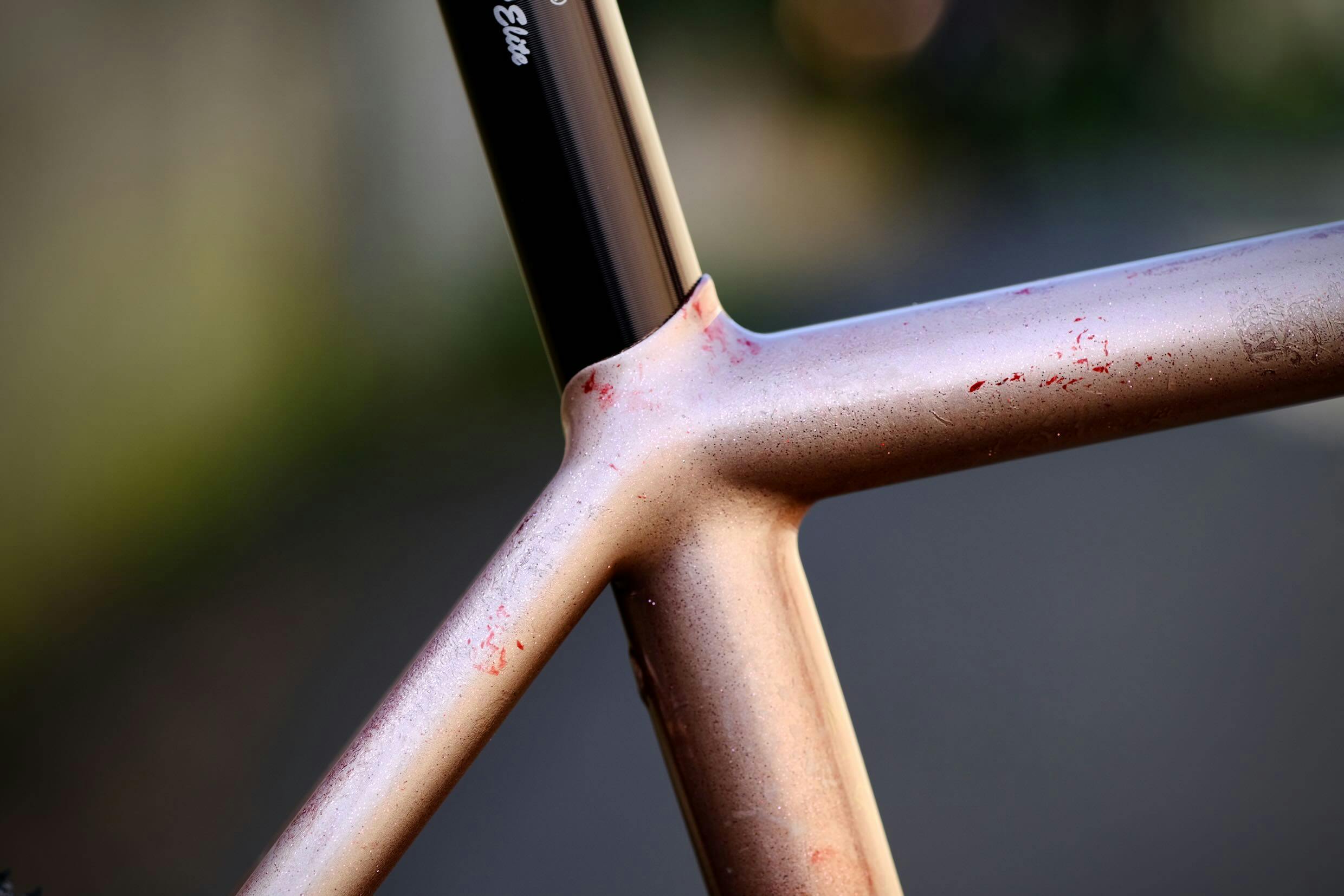 We used all of our know-how to clean up the bike's lines: internal cable routing, seat clamp integrated into the seat stays. To protect the paintwork (which we present below), we welded a small stainless steel bar on the head tube to avoid any friction with the cables.