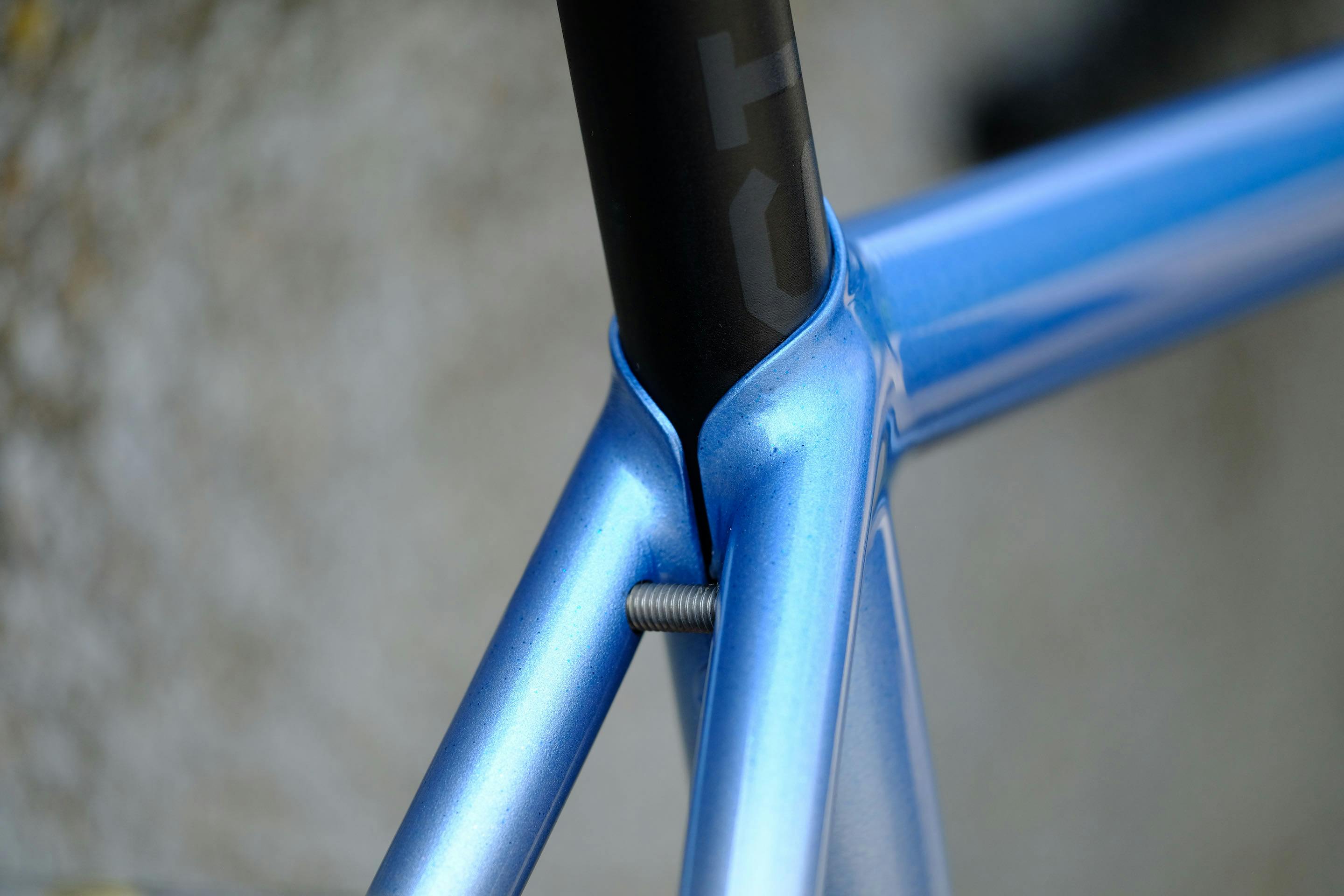 Associating the frame with a steel fork and 1''1 / 8 steerer allows the use of small diameter tubes from the Colombus Life range. Beyond the aesthetic aspect, this combination brings a lot of comfort to this frame suitable for fast hiking. In this type of event, we look for a bike that spins overhead rather than a rigid acceleration bomb, which would be tiring for the body in the long run. In order to obtain the most uncluttered frame possible, Fabien chose an internal passage for his cables as well as a tightening of the seat post fully integrated into the seatstays. This option, difficult to achieve, makes the tightening system completely invisible.