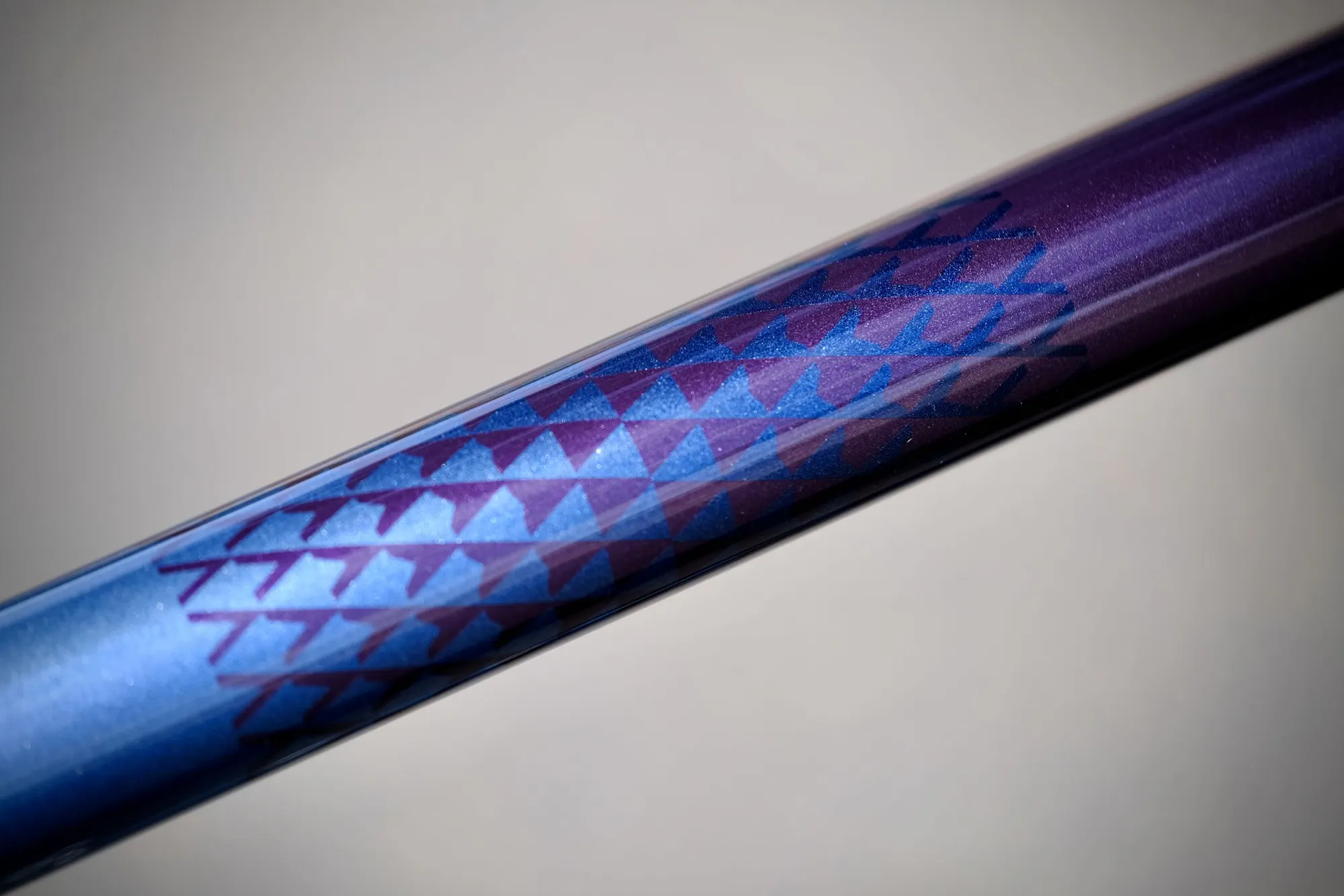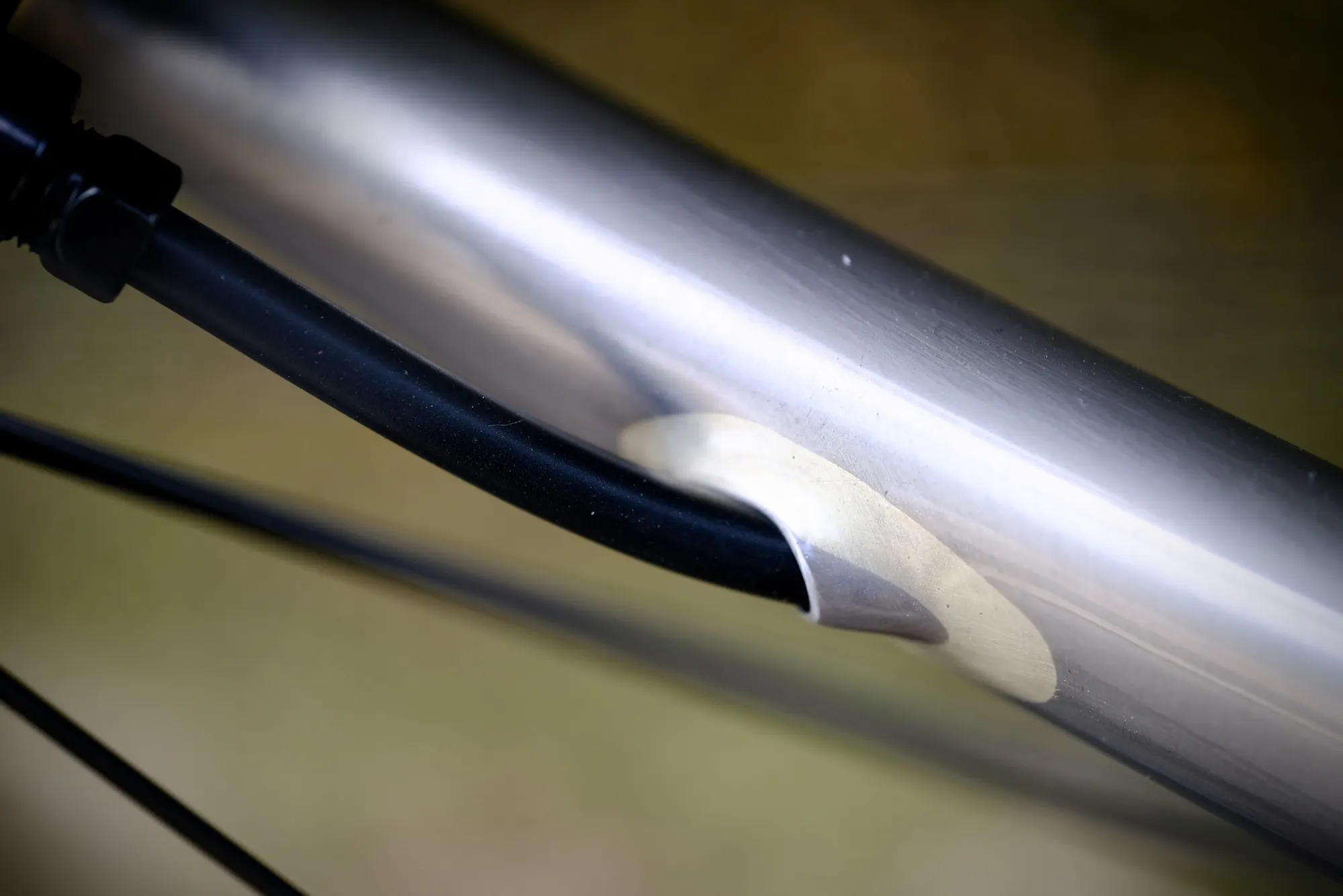 We chose a paint scheme mixing blue, purple and raw metal (a detail made possible by the frame's stainless steel). The transitions between the different parts of the frame are achieved with gradients and geometric masking. The whole is covered with a glossy, polished varnish. The weld seams are visible on the rear of the frame.