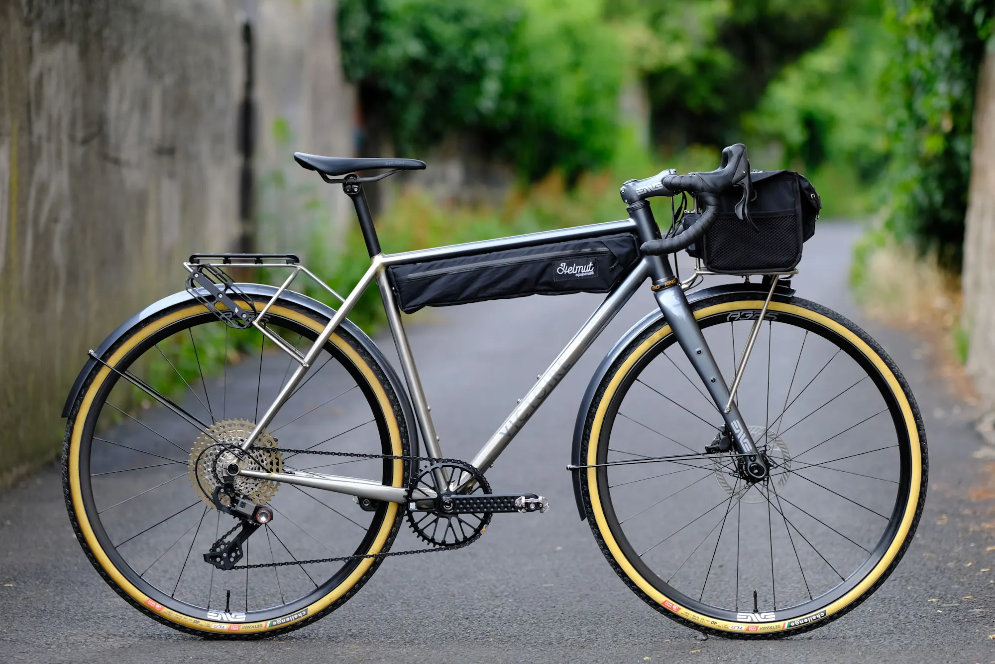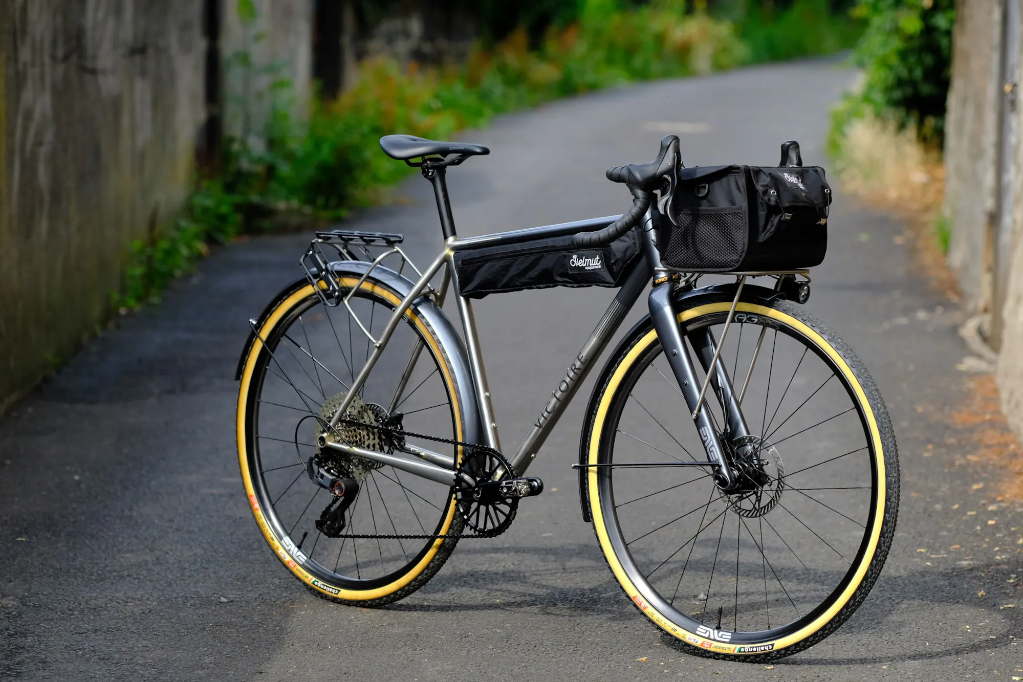 At John's request, Rodolphe, the founder of Helmut Equipment made a front bag and frame bag especially for this project, out of black XPac canvas, which is lightweight, durable and waterproof.