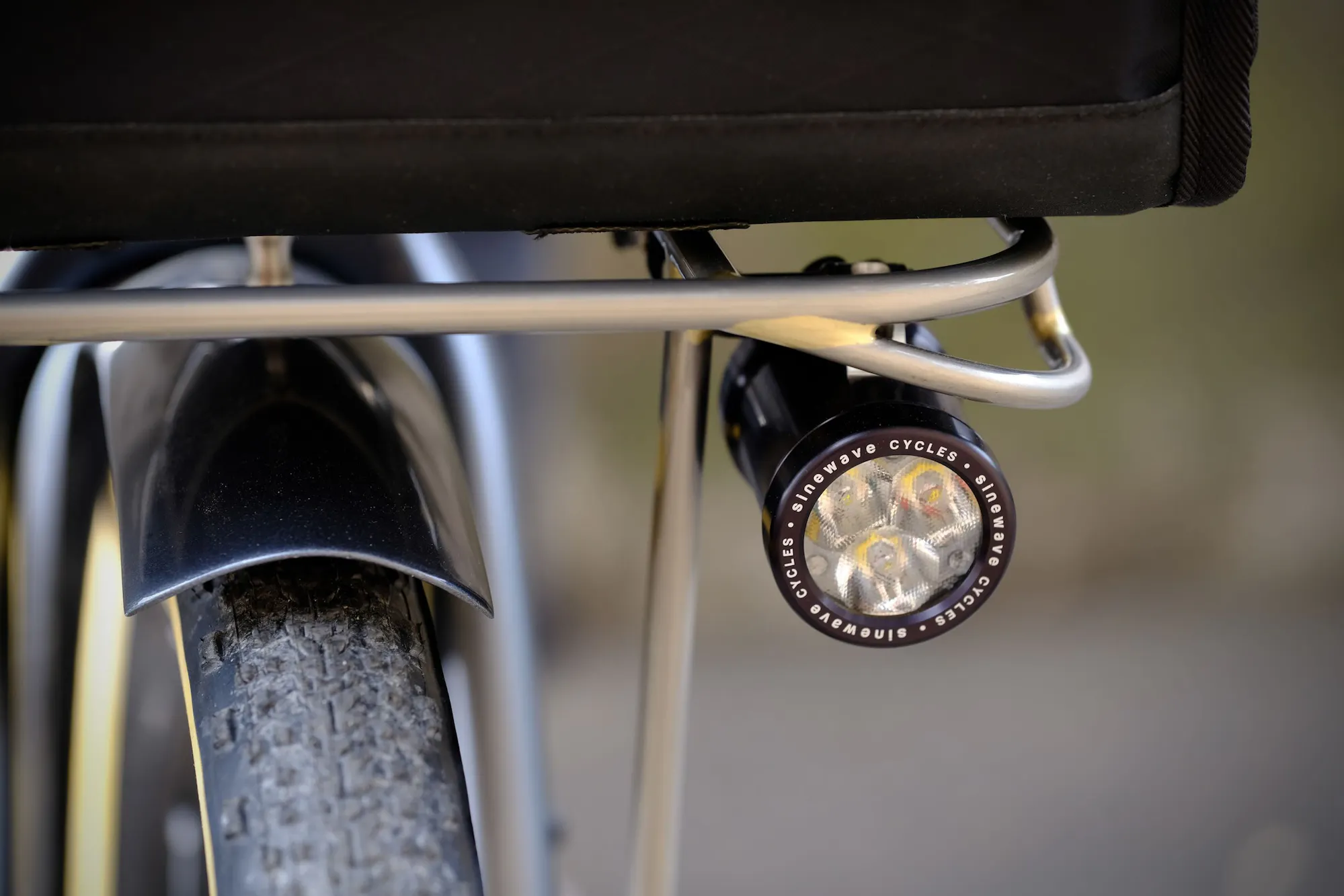 The front luggage rack is the result of many hours of work in the workshop. This original piece, made of stainless steel, is very light. It has an integrated shifter to fix the Helmut pannier, and a Sinewave lamp holder with lamp protection, already used on the Victoire 490.