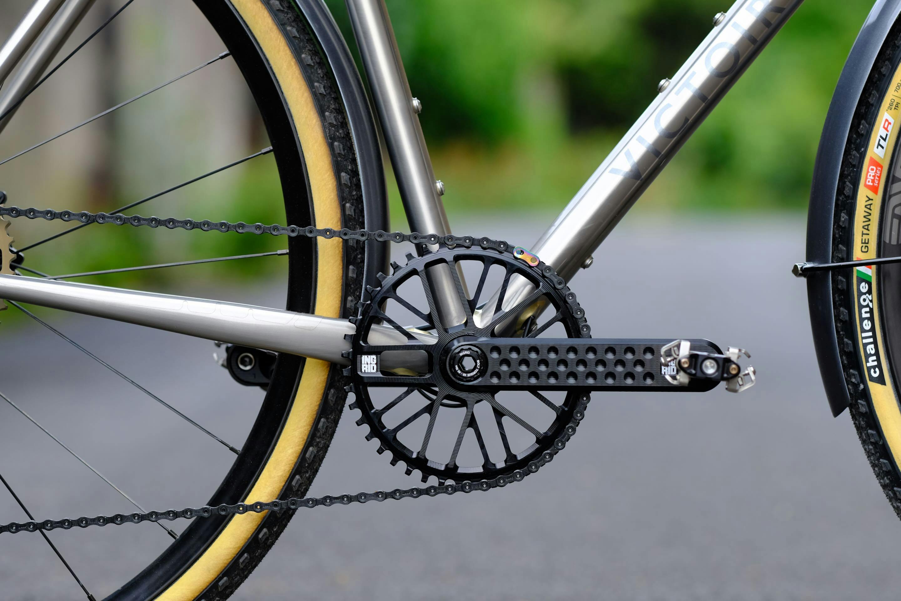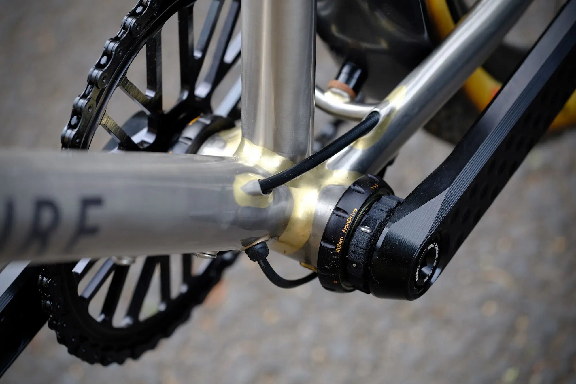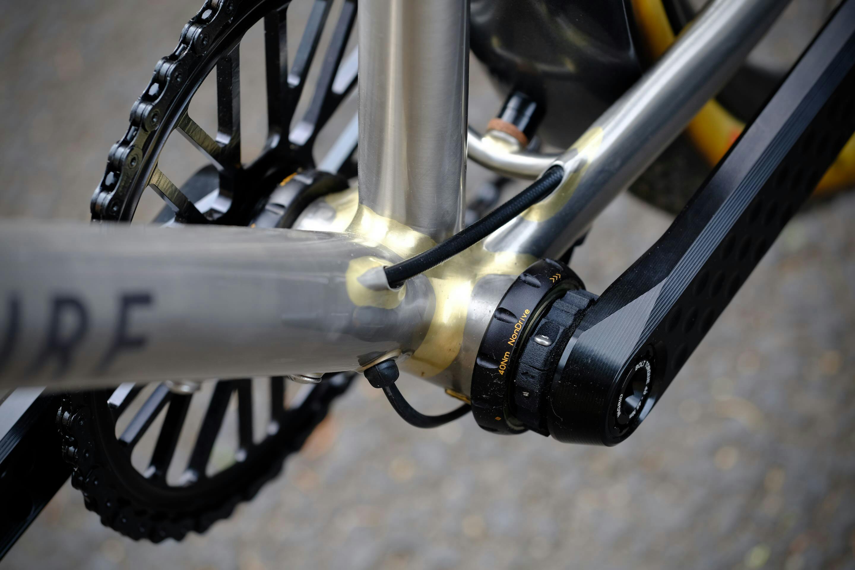 For the painting, John's wishes were: sobriety, discretion and visibility of the hair cords. To emphasise the raw stainless steel, we selected a slightly bluish grey. The gold Chris King markings and the tyre sidewalls are reminiscent of brazing.