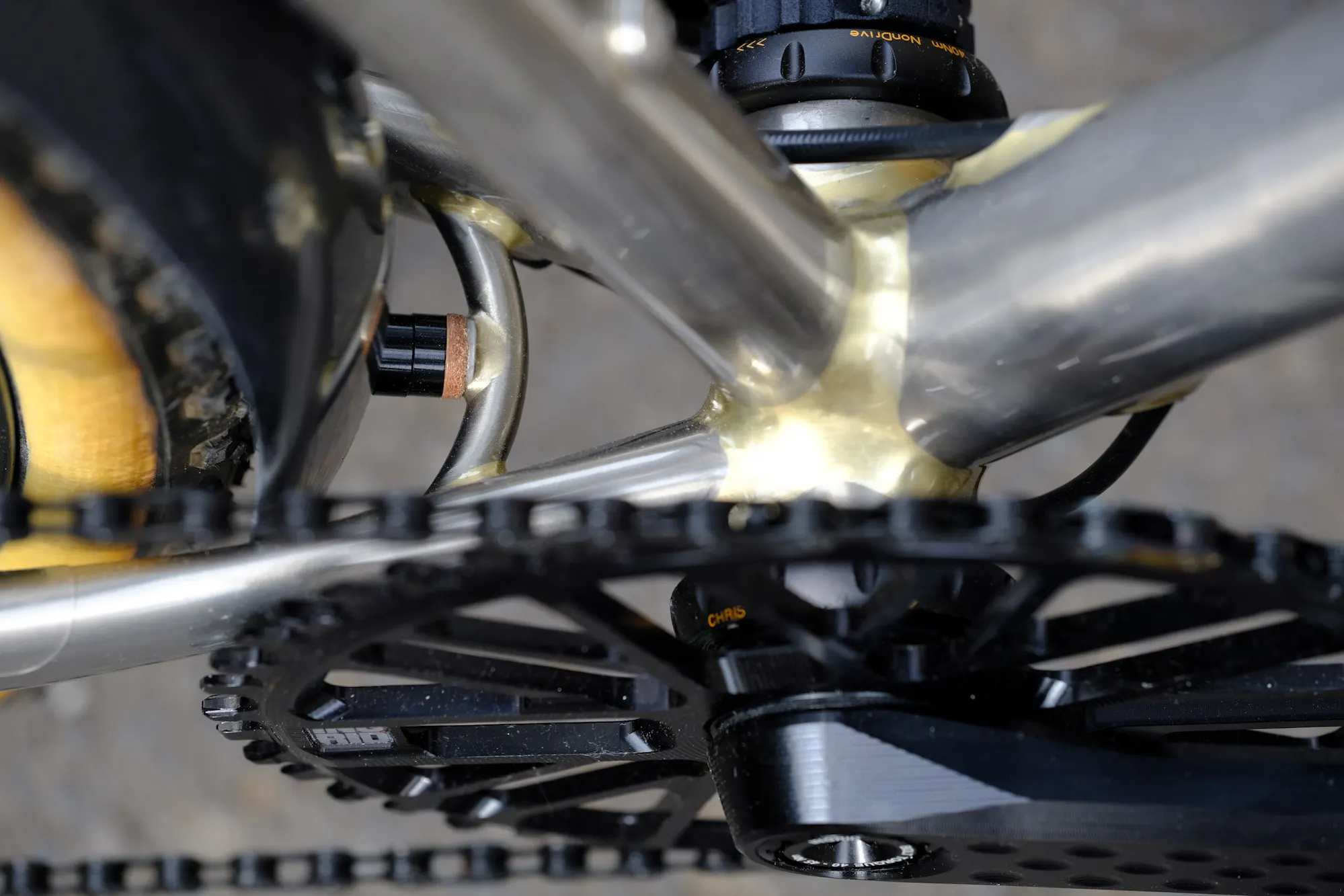 For the painting, John's wishes were: sobriety, discretion and visibility of the hair cords. To emphasise the raw stainless steel, we selected a slightly bluish grey. The gold Chris King markings and the tyre sidewalls are reminiscent of brazing.