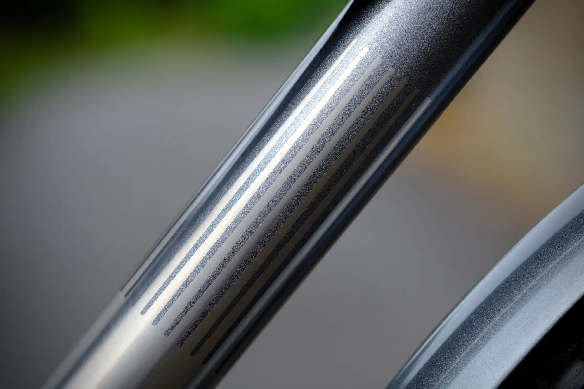 The geometric transition from grey to raw metal adds detail to this very discreet bike, whose aesthetic complexity is revealed as you approach it. The mudguards, fork and stem have been painted in the same tones.