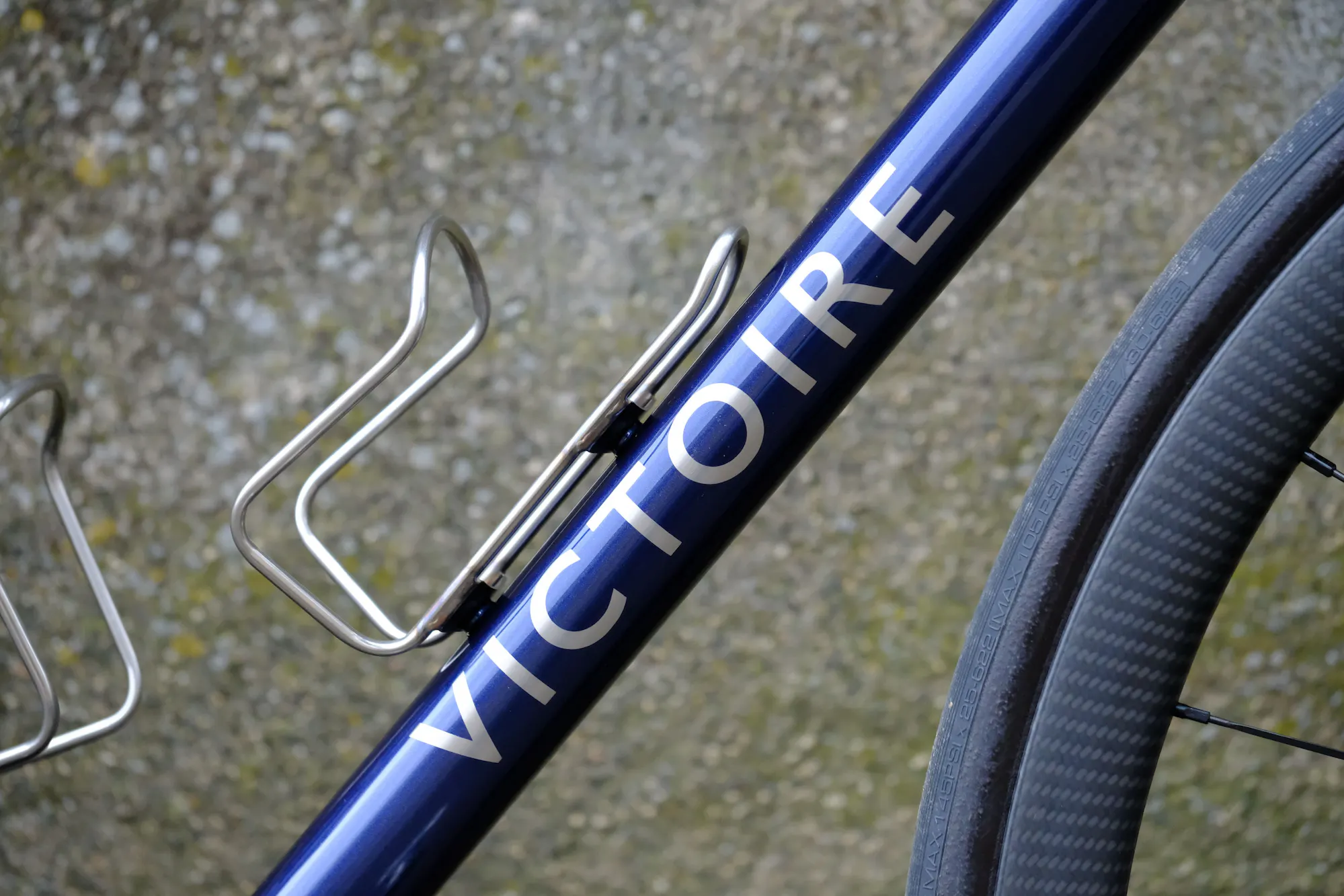 The Victoire 472, as all Victoire bikes now, has been painted by Julien in our workshop's paint room. The painting of François's Efficient needed to be sober and subtile. Frame, fork and stem where painted with a metallic marine blue that fully reveals itself once placed into the sunlight. The logos were made in negative to let the stainless steal appear, dialoguing with the Chris King silver headset.
