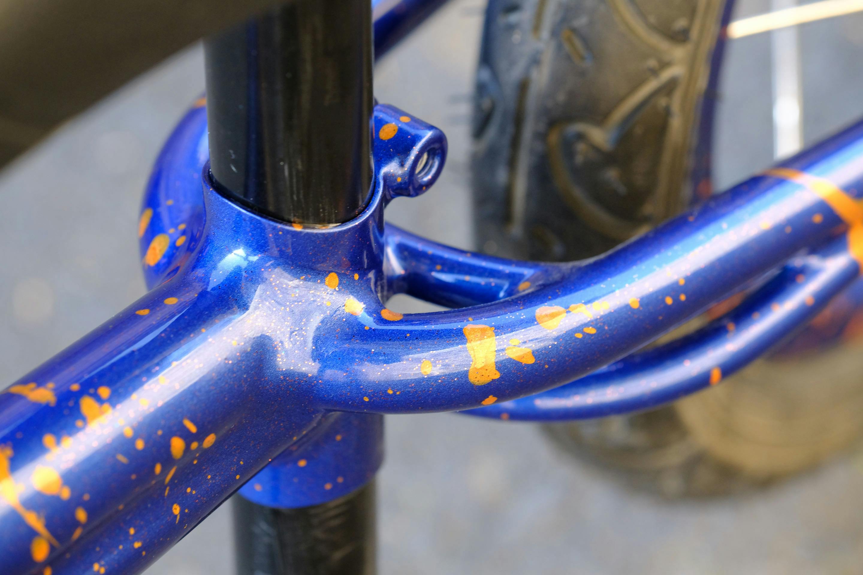 Marcel's favorite color being blue, the frame, fork, stem and rims were painted an electric blue metallic. Numerous spots of light brown metallic echoing the color of the Chris King headset were then projected onto the frame.