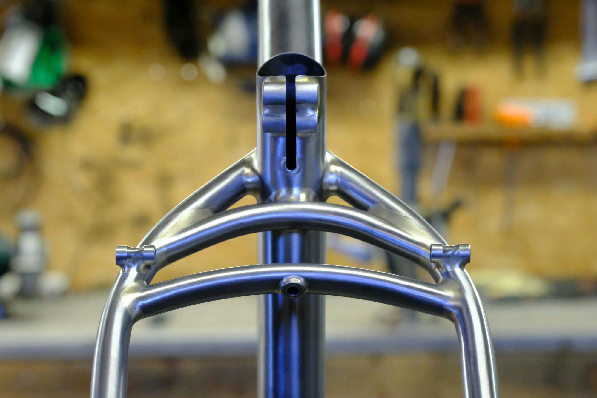 In order to handle off-road use and to have clearance for large tires, the frame has the following specifications : reinforced top tube in 35mm diameter, head tube in 44mm standard, bottom bracket in 120mm width, curved, double seatstay bridge to add strength to the seatpost clamp area.