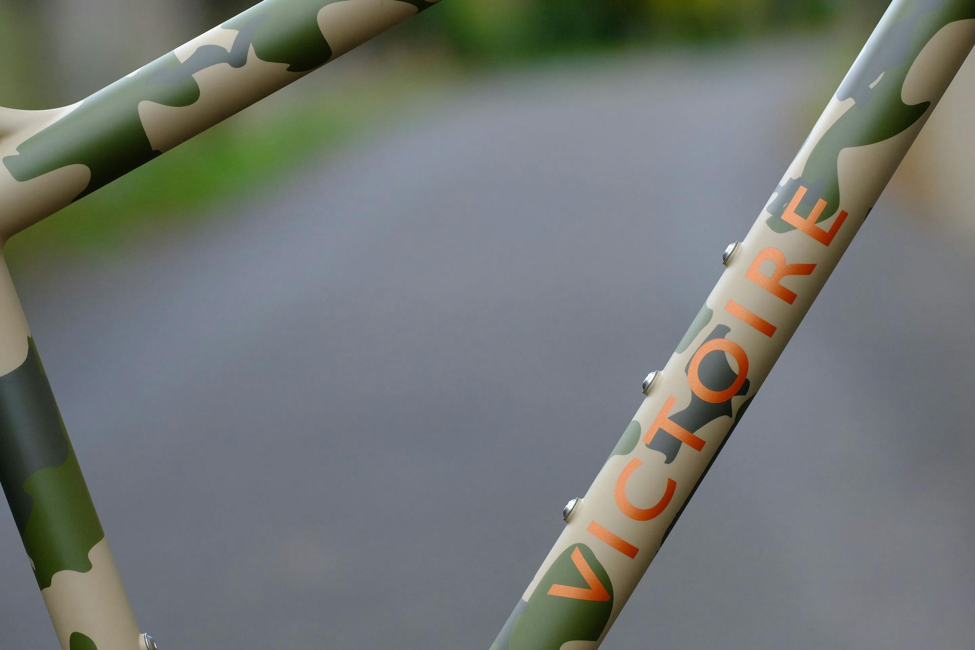 The paint job was done in total secrecy. Marco mentioned that he liked olive drab and khaki colors, and Julien decided to combine both, so the frame matches the orange components.