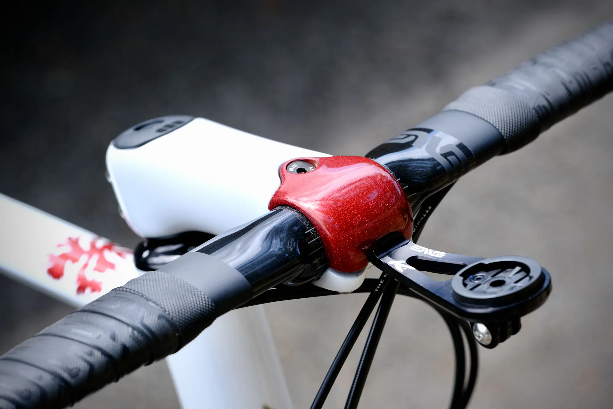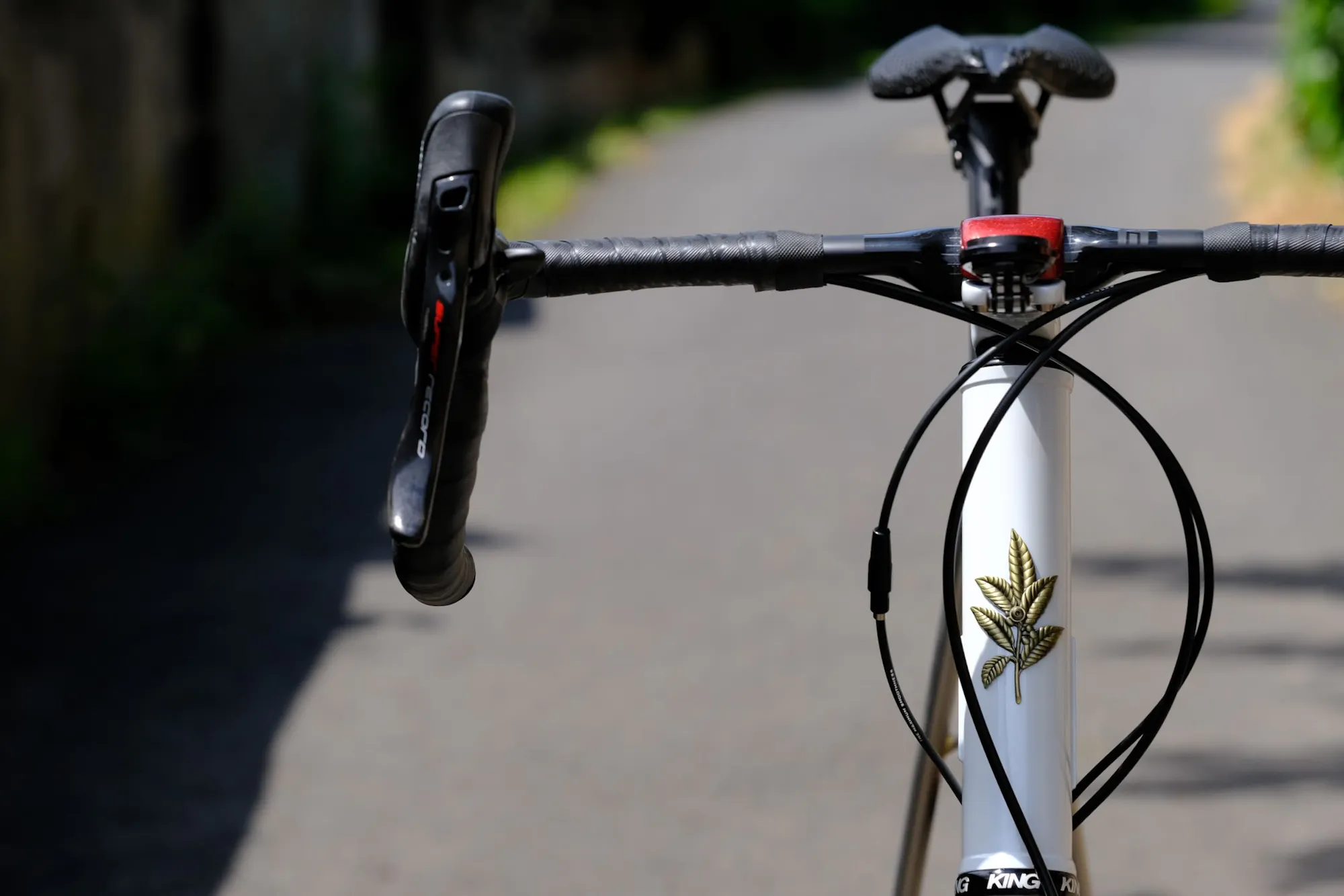 The main color is pearl white, enhanced by a glittery red reminiscent of Super Record typography. This red is found on several elements of the frame, including the stem and an aerial view of Puy Mary on the top tube. Auvergne's cyclists and hikers are no strangers to the slopes of this iconic mountain.
