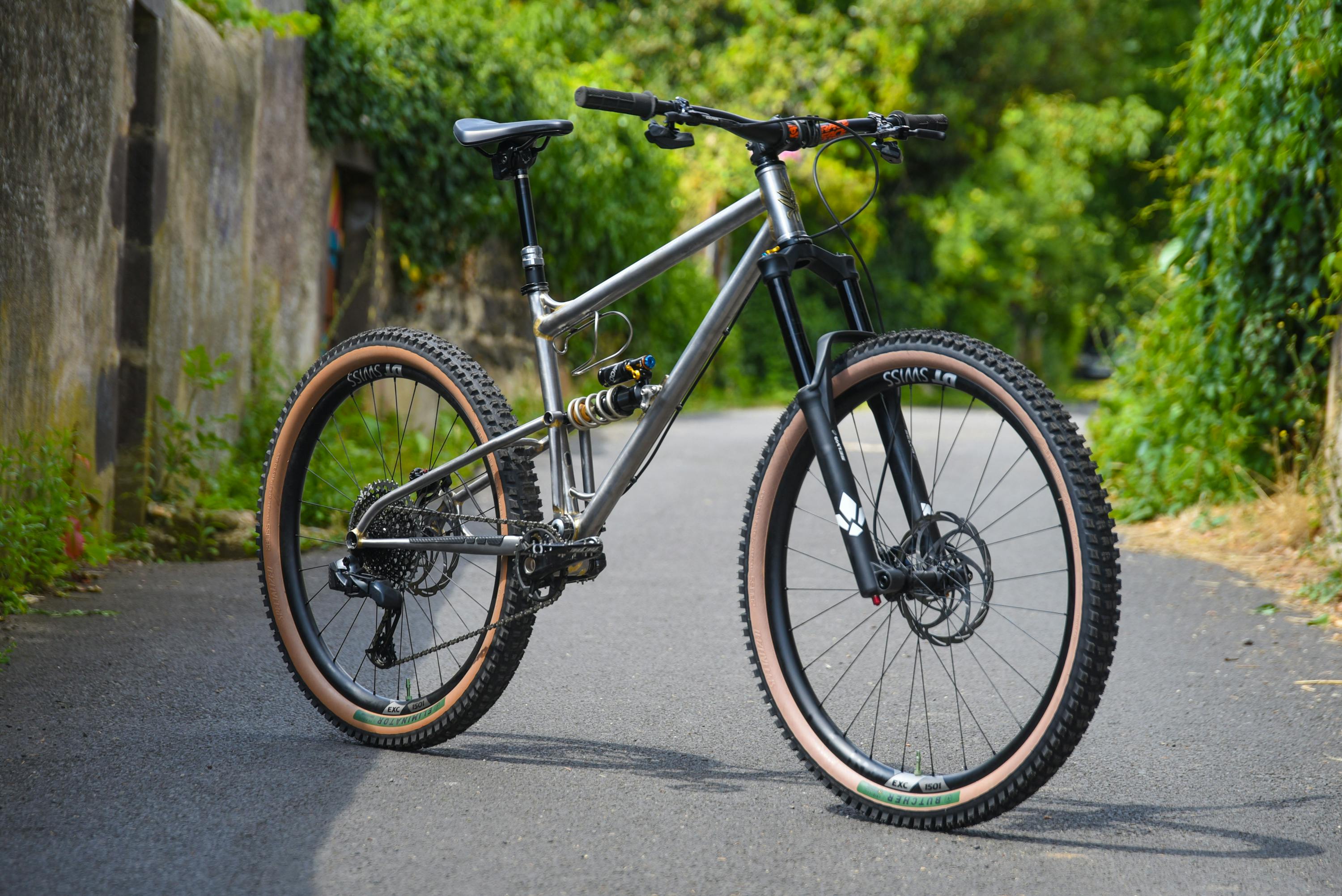 Our first full-suspension prototype is a real committed Enduro bike, with its 160mm Formula fork and big tires with sharp studs.