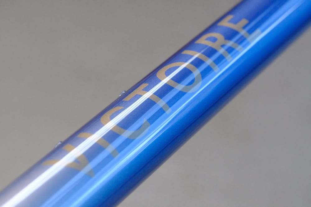 The paint of Victoire n°486 consists of three metallic colors : two for the frame, one for the markings. Pearl white covers the rear triangle of the bike, joining the front triangle painted in gradient lavender blue. The markings are metallic gray. The whole thing was finally clear-coated and polished by hand for a rendering that will stand the test of time.