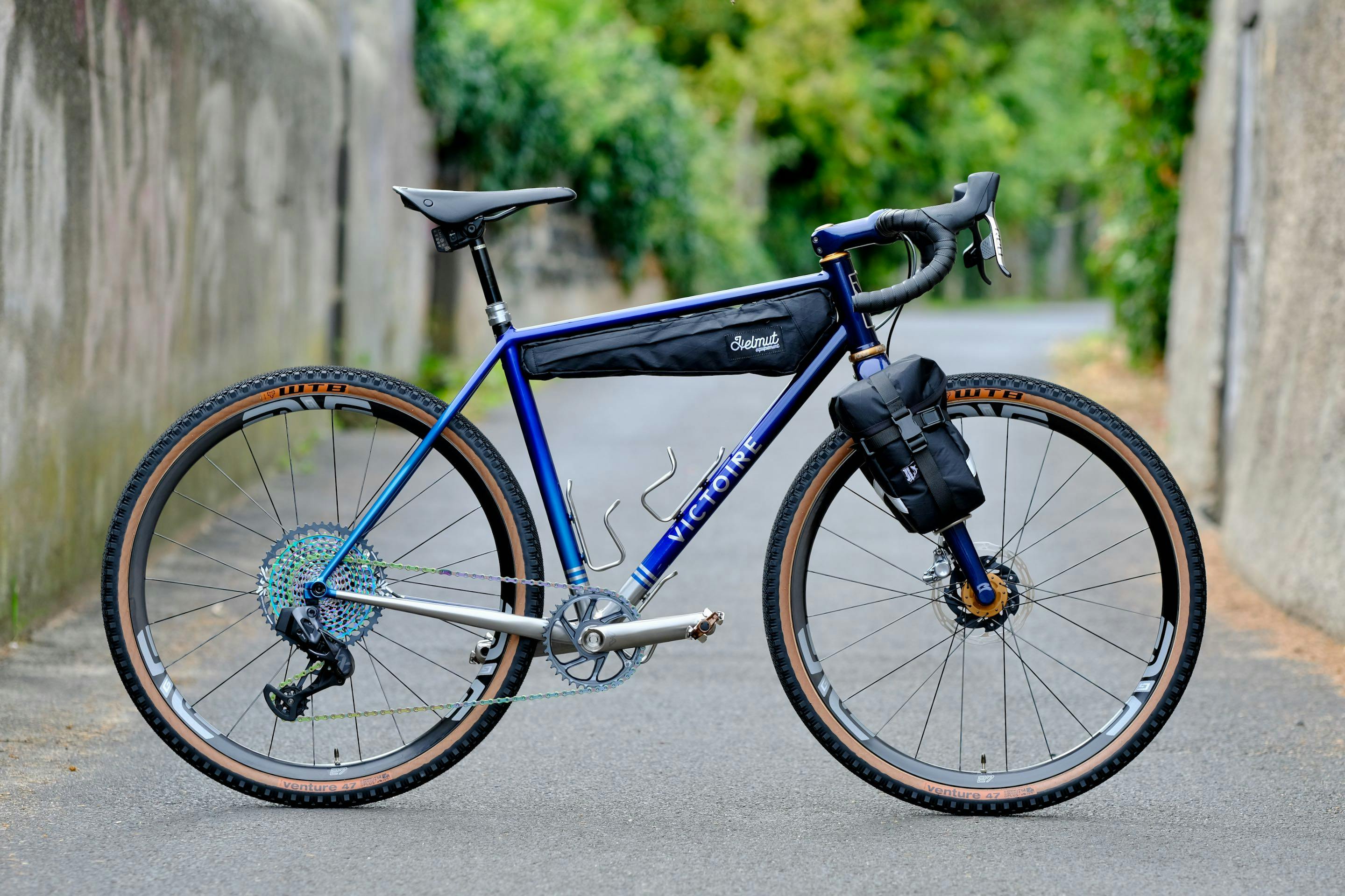 Xavier souhaitait un vélo le plus polyvalent possible, capable aussi bien de franchir un col goudronné que de partir à l’aventure sur des chemins de traverse. Il nous a laissé carte blanche pour réaliser ce Victoire présenté au Chris King Open House, à Portland. Selon les roues choisies et les bagages, il peut être autant un véritable vélo de route qu’un compagnon de voyage passe-partout.