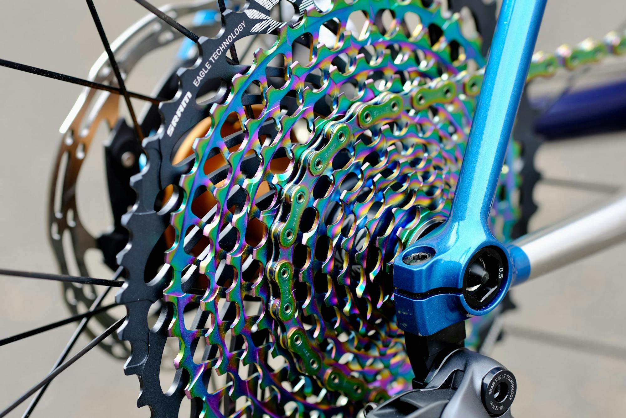 Entre les deux nouveaux coloris de pièces Chris King proposés, violet ou bourbon, nous avons préféré le second. La peinture a été choisie en fonction, avec un triple dégradé de bleu métallisé, entrecoupé de parties brutes laissant apparaitre le travail sur les parties en inox.