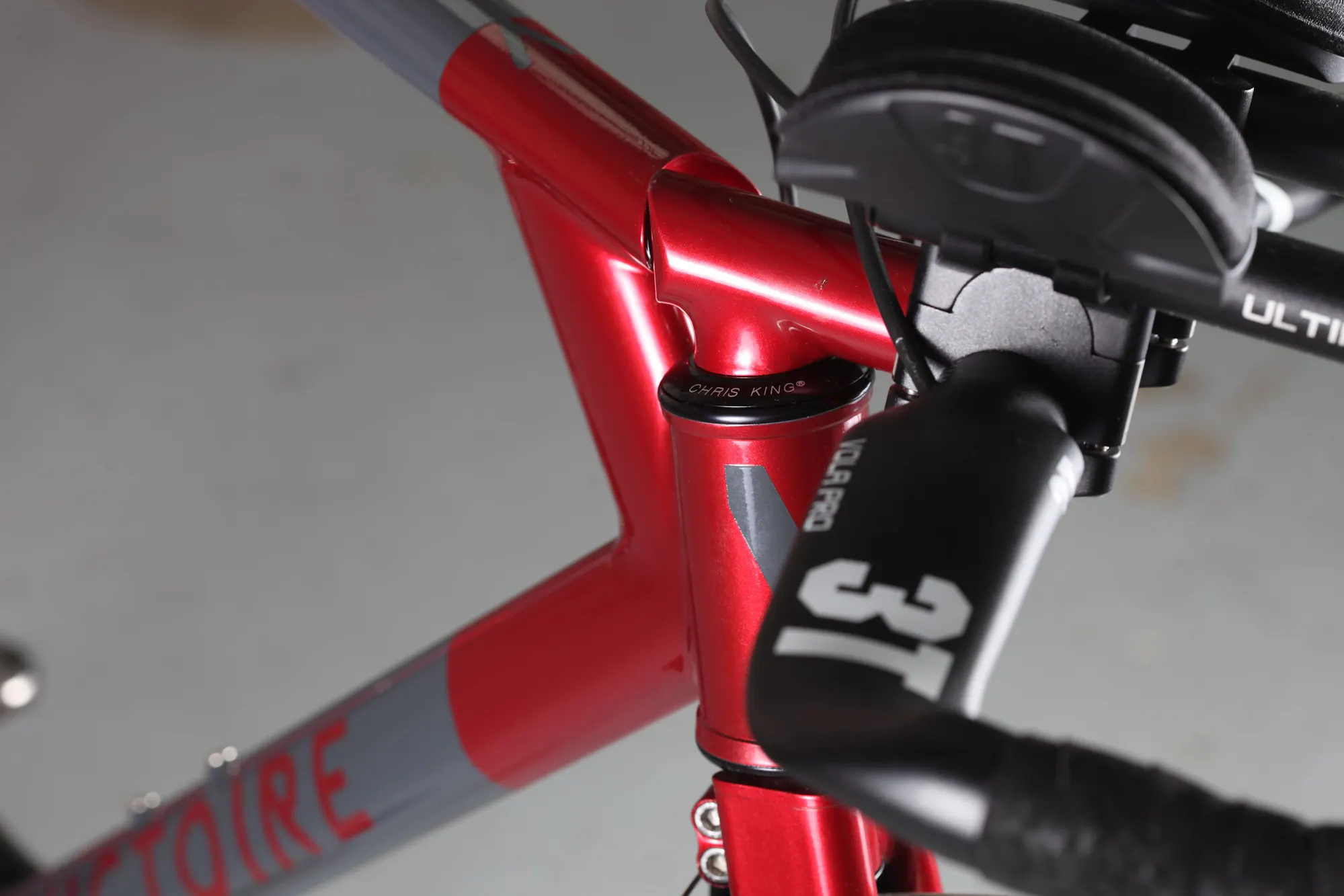 Une fois les points de contacts définis, Julien est parti d’une feuille blanche pour la conception du cadre. L’une des principales différences par rapport aux vélos Victoire classiques réside dans la conception de la fourche, qui est réalisée à l’inverse d’un système headset classique. La potence est ici directement soudée au pivot de fourche avec un angle la positionnant à l’horizontale du sol. Le serrage du pivot s’effectue à l’arrière de la tête de fourche, ce qui permet d’obtenir une fourche compacte et aérodynamique. Les fourreaux Reynolds 853 sont en forme de goutte d’eau pour améliorer la pénétration dans l’air. L’ensemble potence et fourche a demandé à lui seul une semaine de travail.