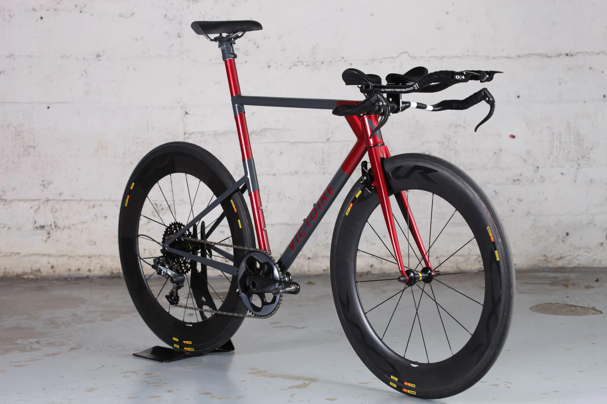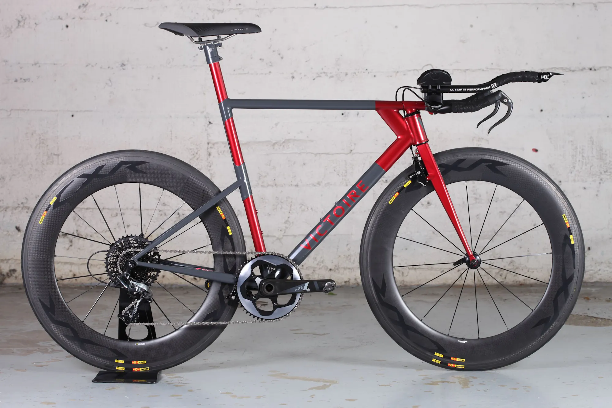 Tristan, heureux possesseur d’un Victoire Virage -avec lequel il s’est aligné au Half-Ironman de Vichy- nous a contacté pour la réalisation d'un vélo de triathlon sur-mesure. Tristan possède un gabarit hors-normes, et ses grandes jambes lui empêchait de se sentir bien sur un vélo de triathlon classique. Il venait de découvrir les réalisations de notre confrère Rob English, et étant nous même admiratifs du travail de Rob, c’est avec beaucoup de plaisir et d’excitation que nous avons accepté de relever le défi en lui réalisant un kit-cadre artisanal adapté à la pratique du triathlon et à ses mesures.