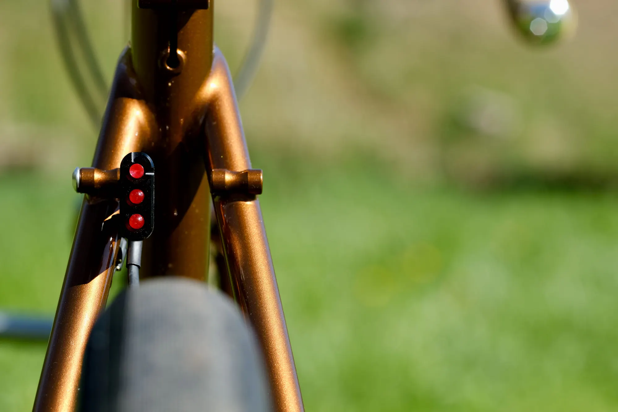 Ici la paire de roues a été rayonnée à la main dans notre atelier avec les rayons DT Révolution. Les jantes sont en aluminium et proviennent de chez Mavic. Le moyeux avant à dynamo est un SON Delux12. Ce type de moyeu permet d'être autonome en électricité. Lumières et chargeurs USB peuvent ainsi être alimentés à l'infini. Le moyeu arrière provient lui de chez HOPE avec le modèle Pro4.