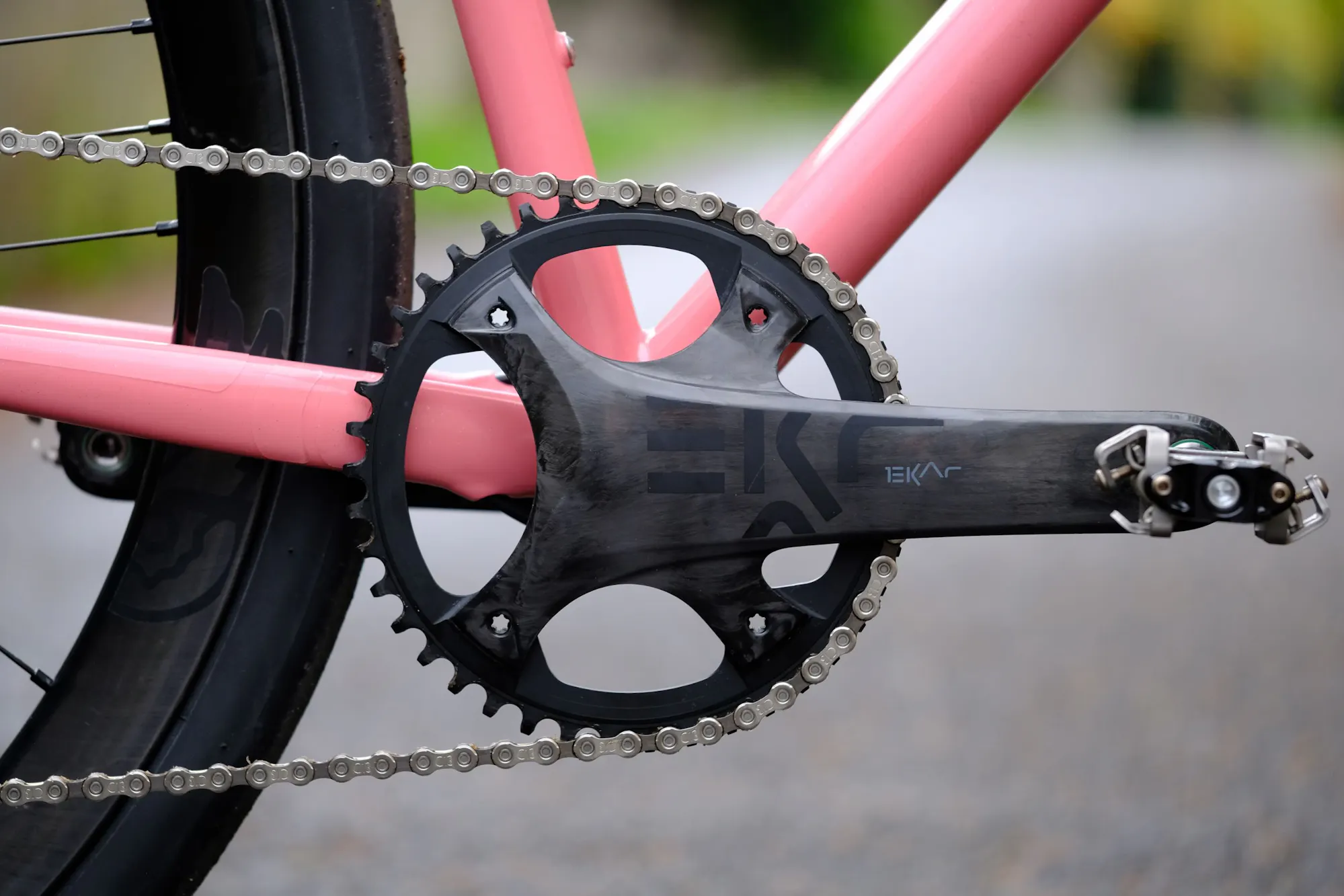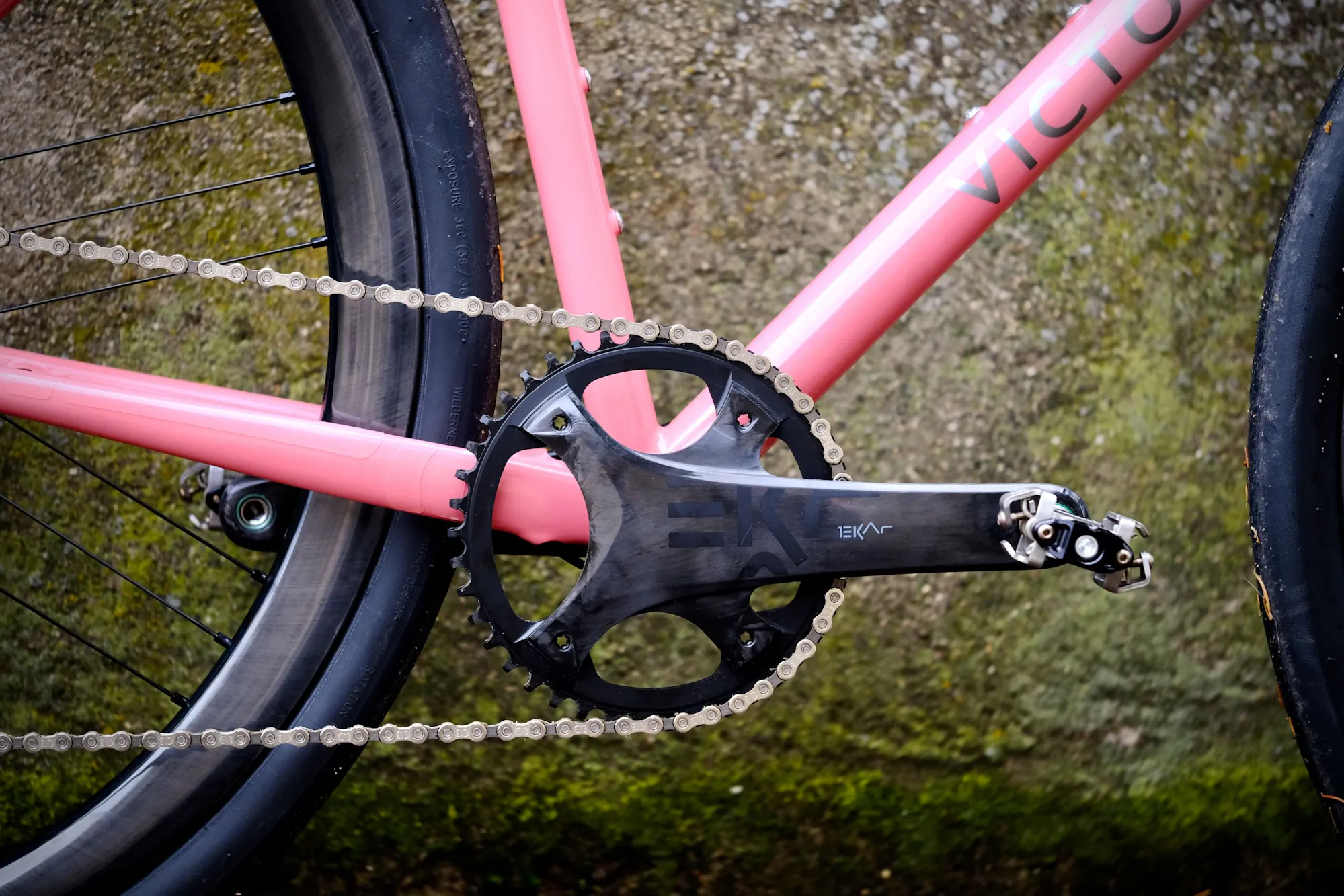 Le groupe Campagnol Ekar est l'idéal pour ce genre de vélo : simple d'utilisation avec son mon-plateau, il propose une cassette bien étagée avec les 13 vitesses pour une utilisation route. Son esthétique est dépouillée et rappelle les moto café-racer de l'époque du milieu du vingtième siècle.