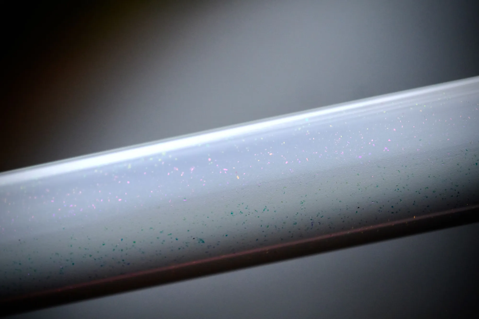 La peinture du Victoire café-racer est faite d'un dégradé qui va de blanc nacré à rose, surmonté de très fines paillettes holographiques (qui changent de couleur suivant l'orientation de la lumière). Après la pose d'un vernis intermédiaire, les logos en gris métallisé ont été ajoutés puis l'ensemble recouvert d'un vernis final avant d'être poli et lustré.
