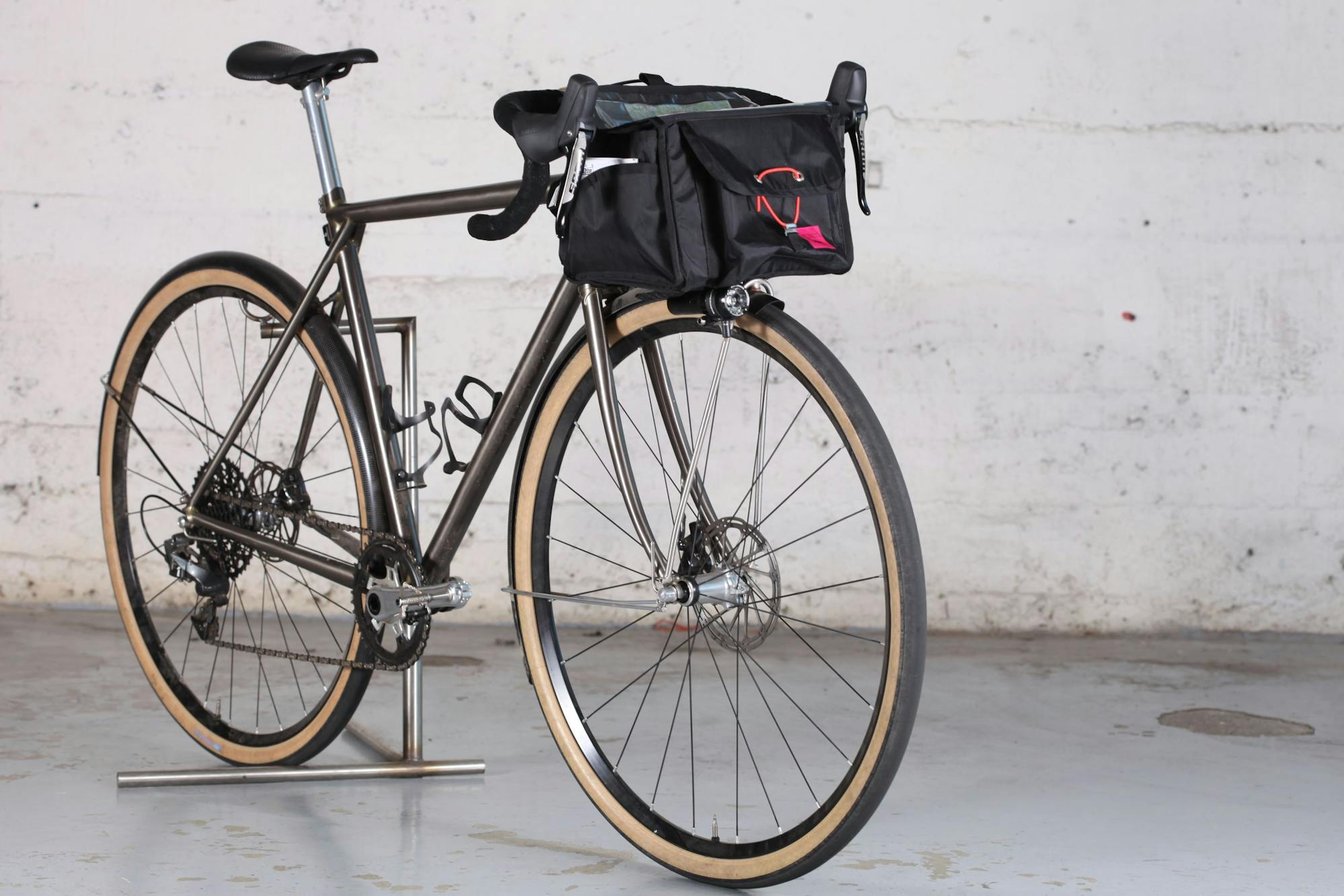 Enfin, nous avons réalisé un rack avant minimaliste associé à un système de décaleur. Il nous fallait une sacoche pour transporter notre matériel ainsi que les 10 exemplaires du magazine 200 lors de l'une des trois épreuves. Notre choix s'est porté sur le modèle Ozette Randonneur de Swift Industry qui reprend l'esthétique des sacoches randonneur classiques avec l'utilisation de matériaux modernes, en l'occurence le X-Pac, à la fois léger, imperméable et résistant.