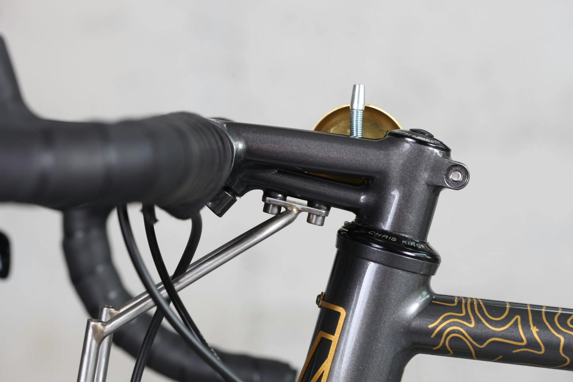 La potence est une évolution de notre modèle de l’année dernière, réalisée avec trois tubes de petits diamètres et inspirée de la célèbre potence de René Herse. Le modèle de cette année est plus compact en hauteur et utilise des haubans Columbus max ovalisés pour les trois tubes du corps. Elle adopte également un serrage de guidon en 31.8mm. Le tube inférieur, soudé horizontalement, possède des inserts usinés en inox avec filetage pour pouvoir accueillir la fixation du décaleur. Ce dernier a été également réalisé sur-mesure pour adapter la sacoche Swift Industries.