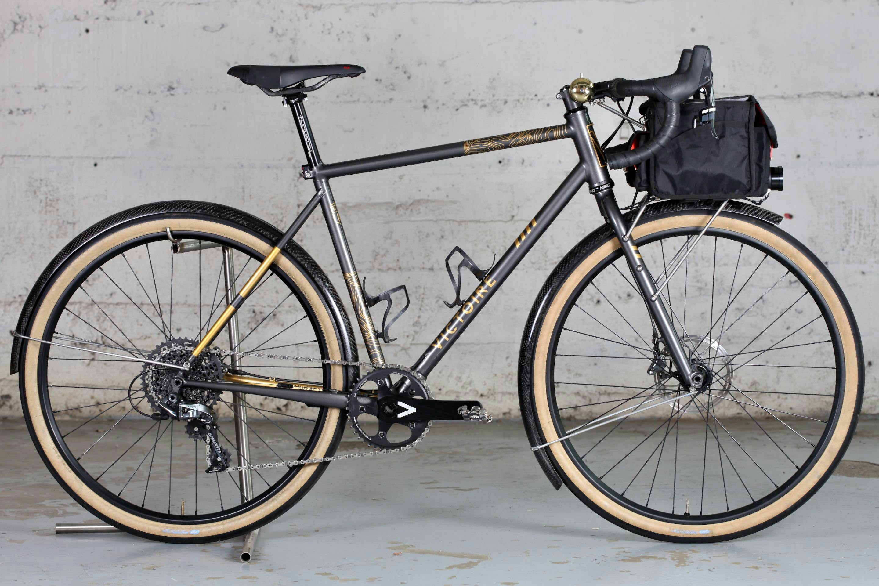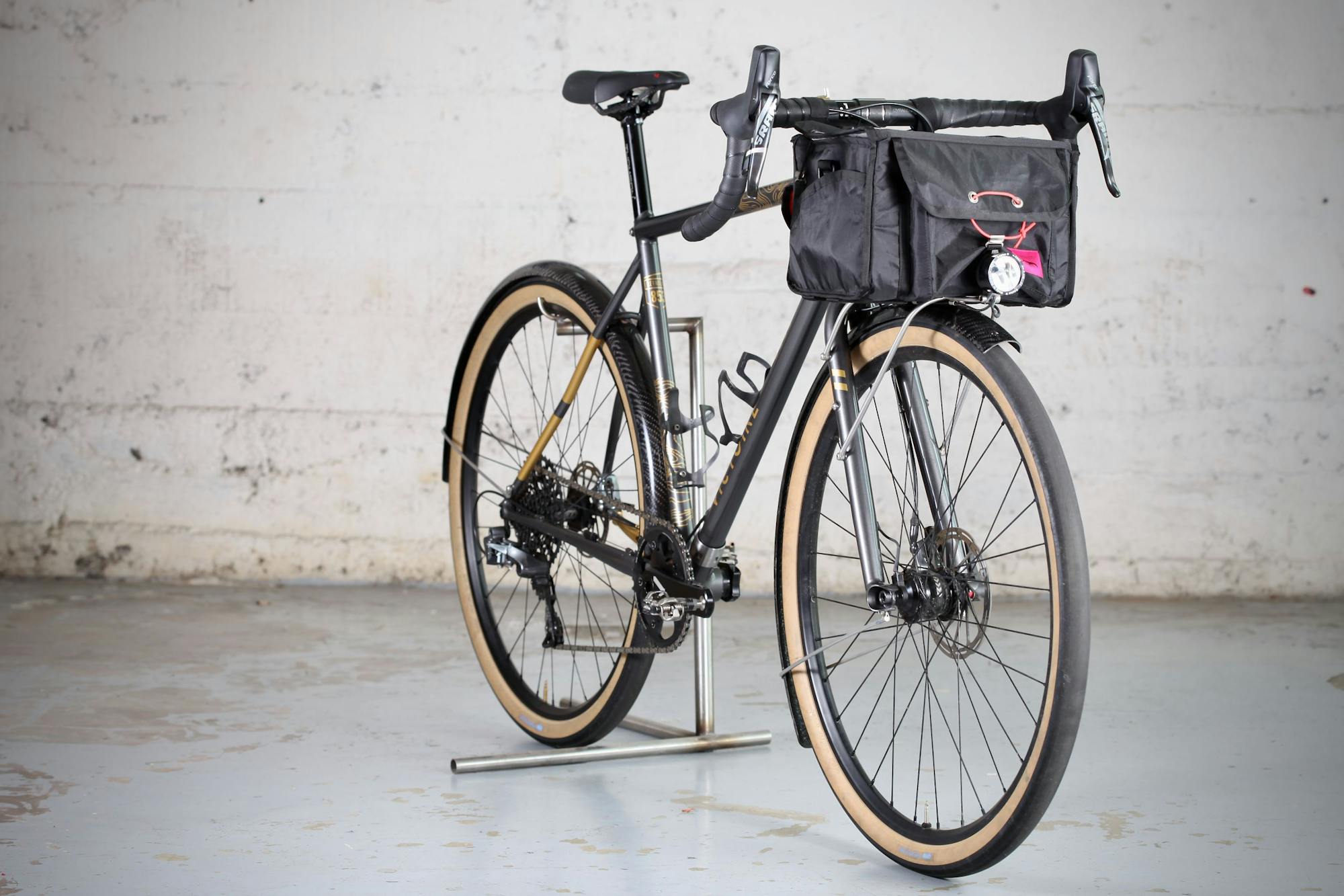 Notre objectif pour 2017 était de présenter au Concours de Machines un modèle abouti, qui reflète notre vision de la randonneuse moderne. Pour cela nous n'avons pas cherché à suivre le barème point par point, mais plutôt à employer des solutions techniques qui nous paraissaient primordiales pour cette pratique. Selon nous, une randonneuse moderne est un vélo fiable, léger et confortable, capable d'avaler plusieurs centaines de kilomètres par jour sur routes et chemins, de jour comme de nuit, quelles que soient les conditions et en autonomie complète. Pour cela, elle doit permettre de transporter un minimum de bagages.