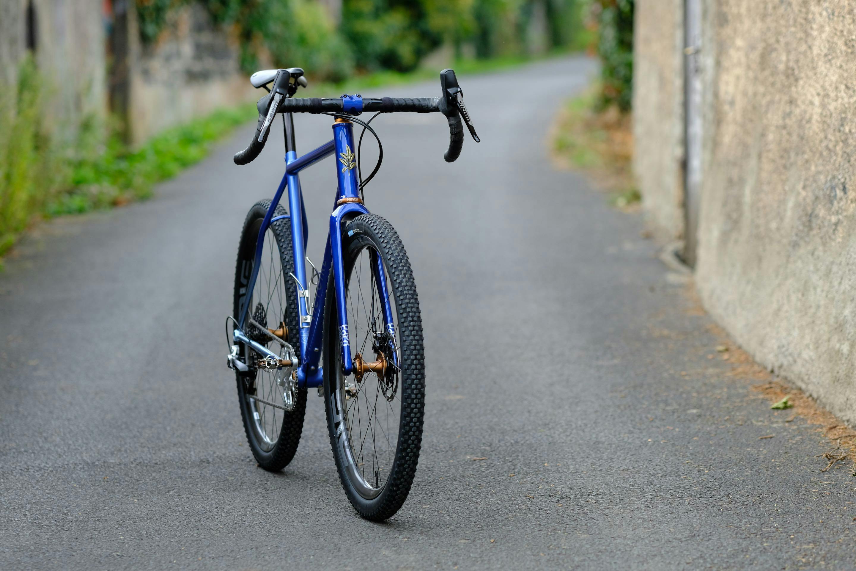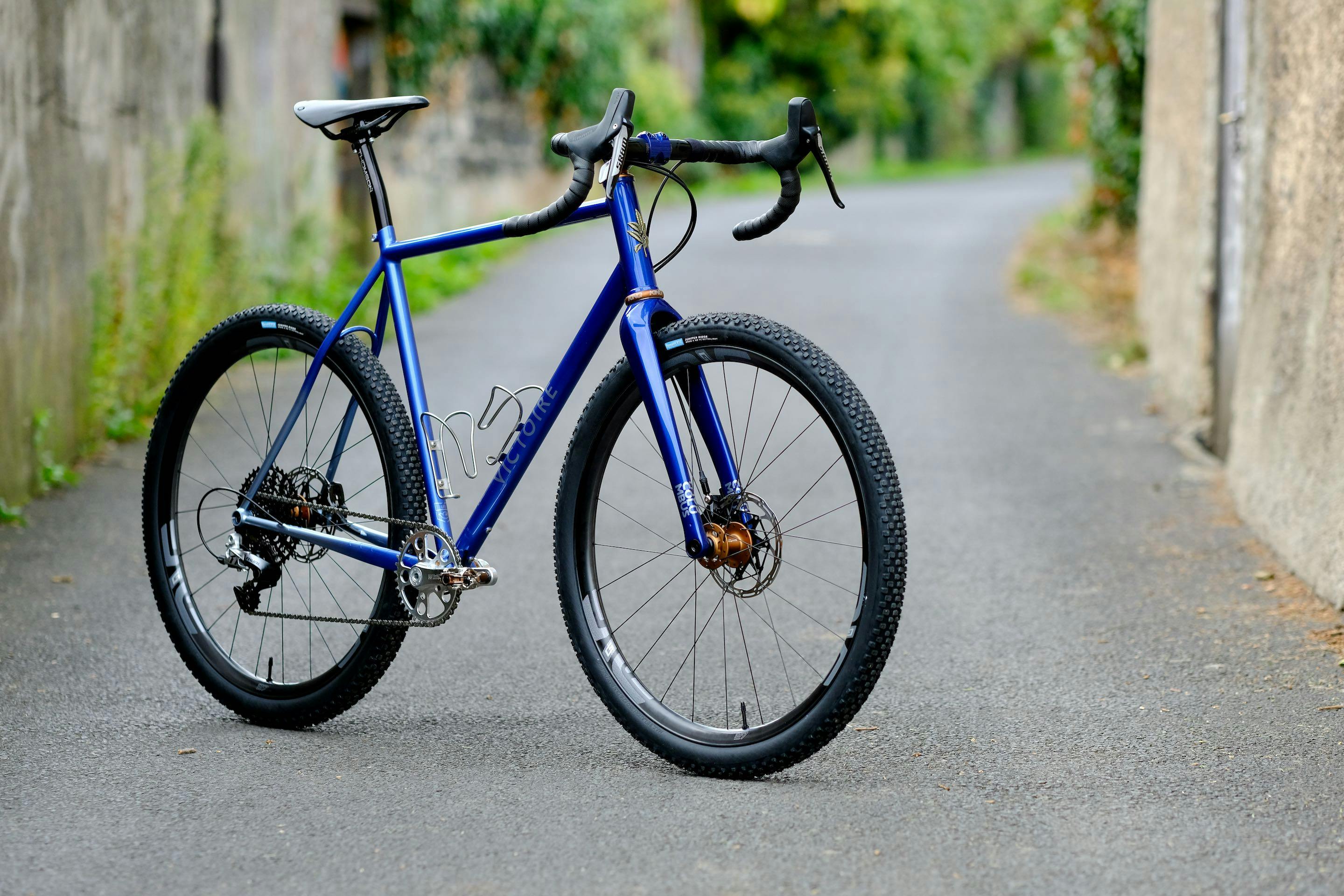 Ce vélo de gravel est monté en roues de 650B, choix réalisé en fonction de la morphologie de Romain. La géométrie moderne de ce vélo, aux angles couchés et à la potence courte, a été conçue pour correspondre parfaitement à son propriétaire.