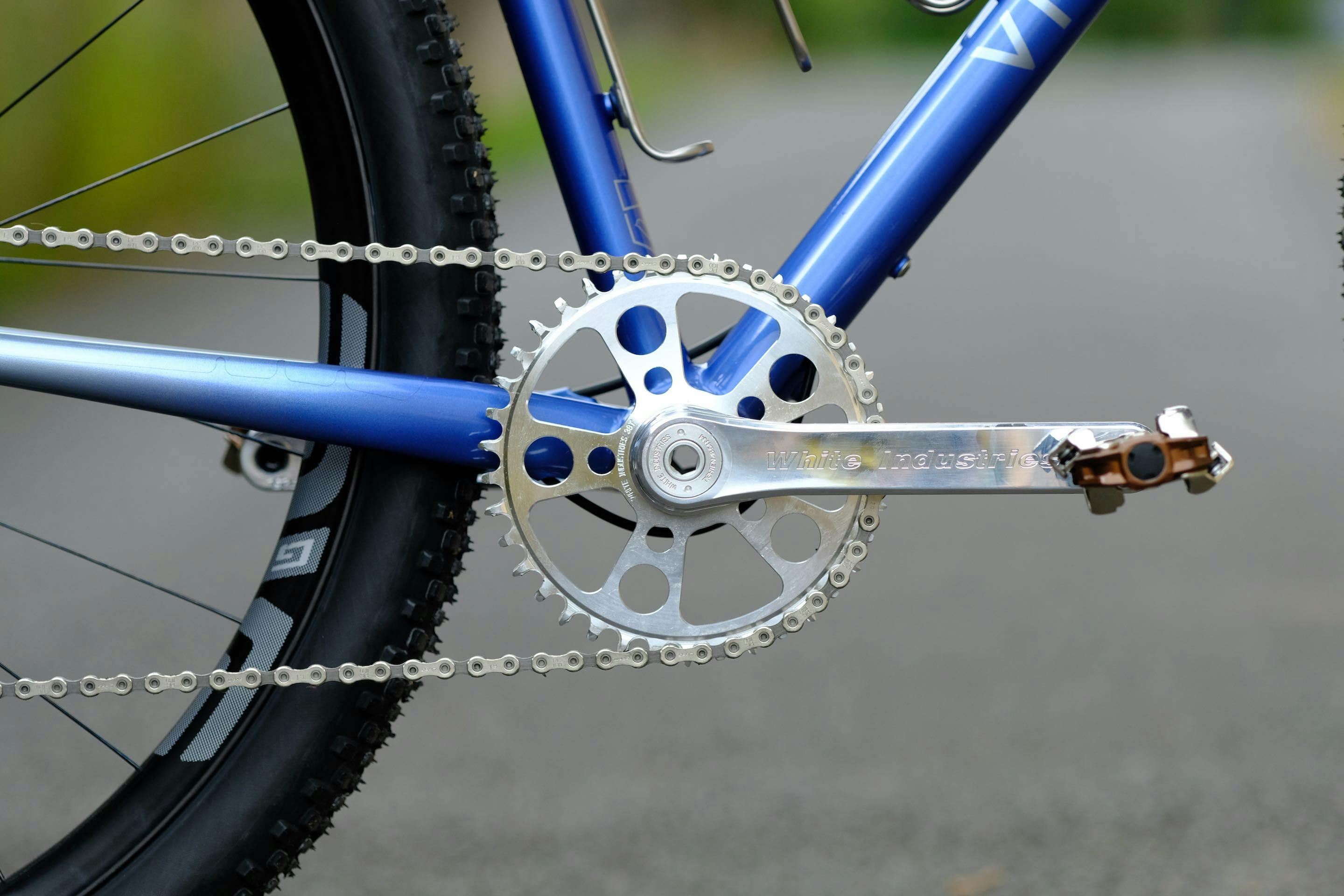 Le boitier de pédalier Chris King Threadfit 30x accueille un pédalier d'une autre marque américaine : White Industrie. Romain a très justement choisi celui-ci en version polie pour éviter que l'anodisation ne se dégrade avec la boue, phénomène probable sur un vélo destiné aux chemins. Cet aspect poli vient fait également écho avec le travail de peinture du triangle arrière.