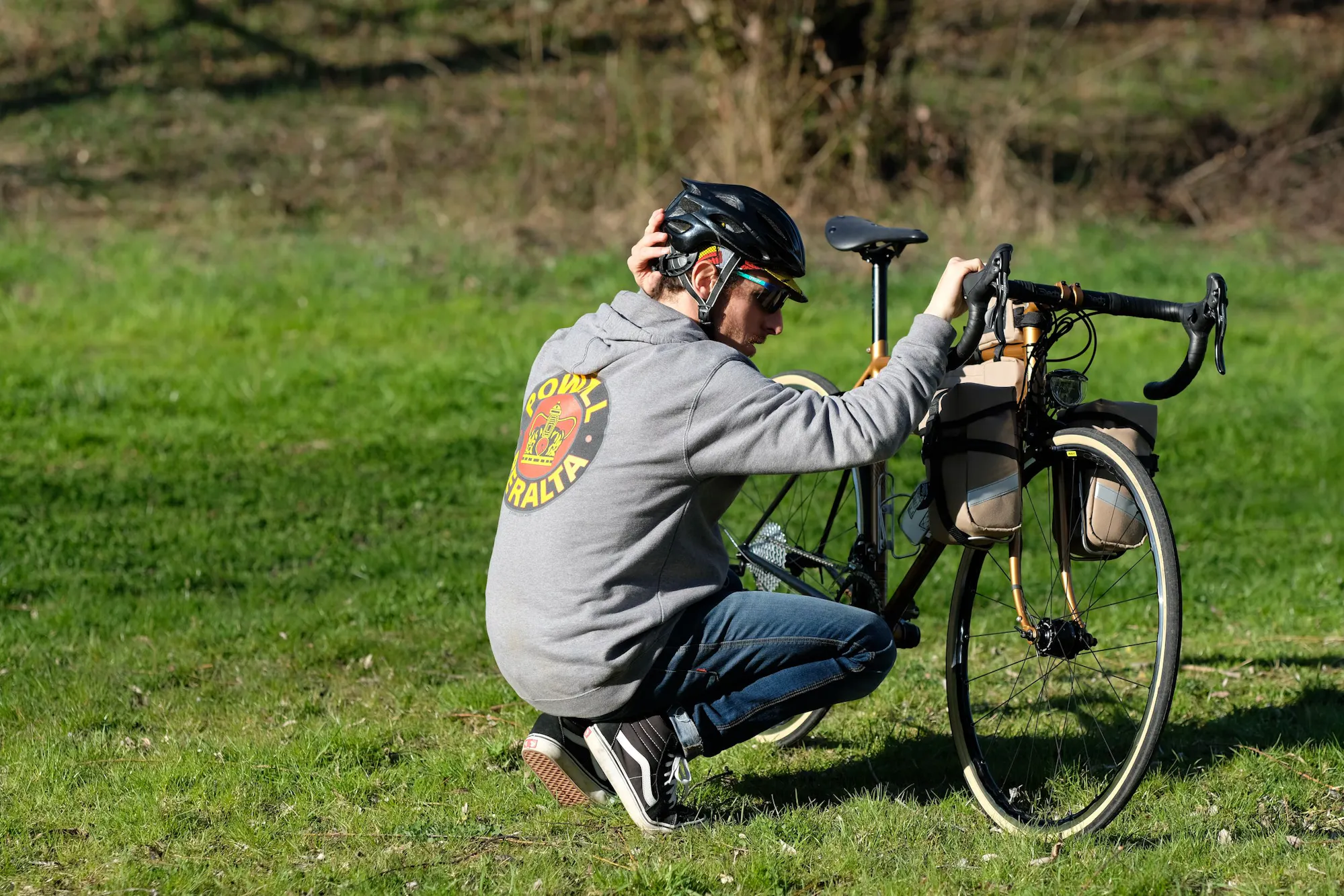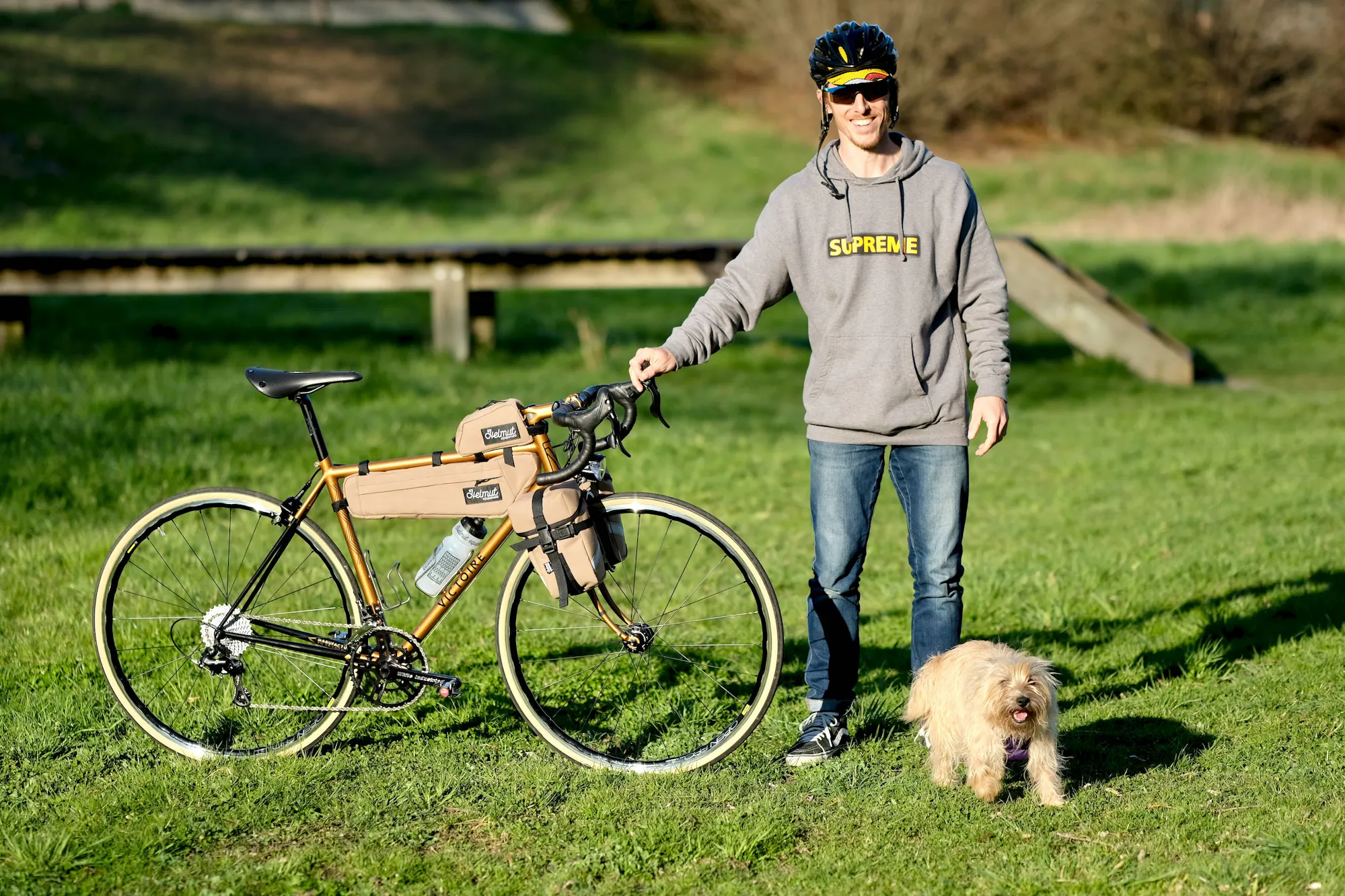 Rodolphe est le fondateur de la marque de bagages Helmut Equipement, une de nos marques partenaires les plus proches. Pilote d’enduro et aventurier des voyages à vélo, Rodolphe souhaitait un vélo de route polyvalent pour le charger comme un voyageur et sportif pour s'attaquer à différentes longues distances et challenges. Son vélo a été réalisé dans le cadre de nos essais de développement pour notre nouvelle marque Distance. Pour répondre aux souhaits de Rodolphe, ce cadre a été conçu pour des longues journées en selle.