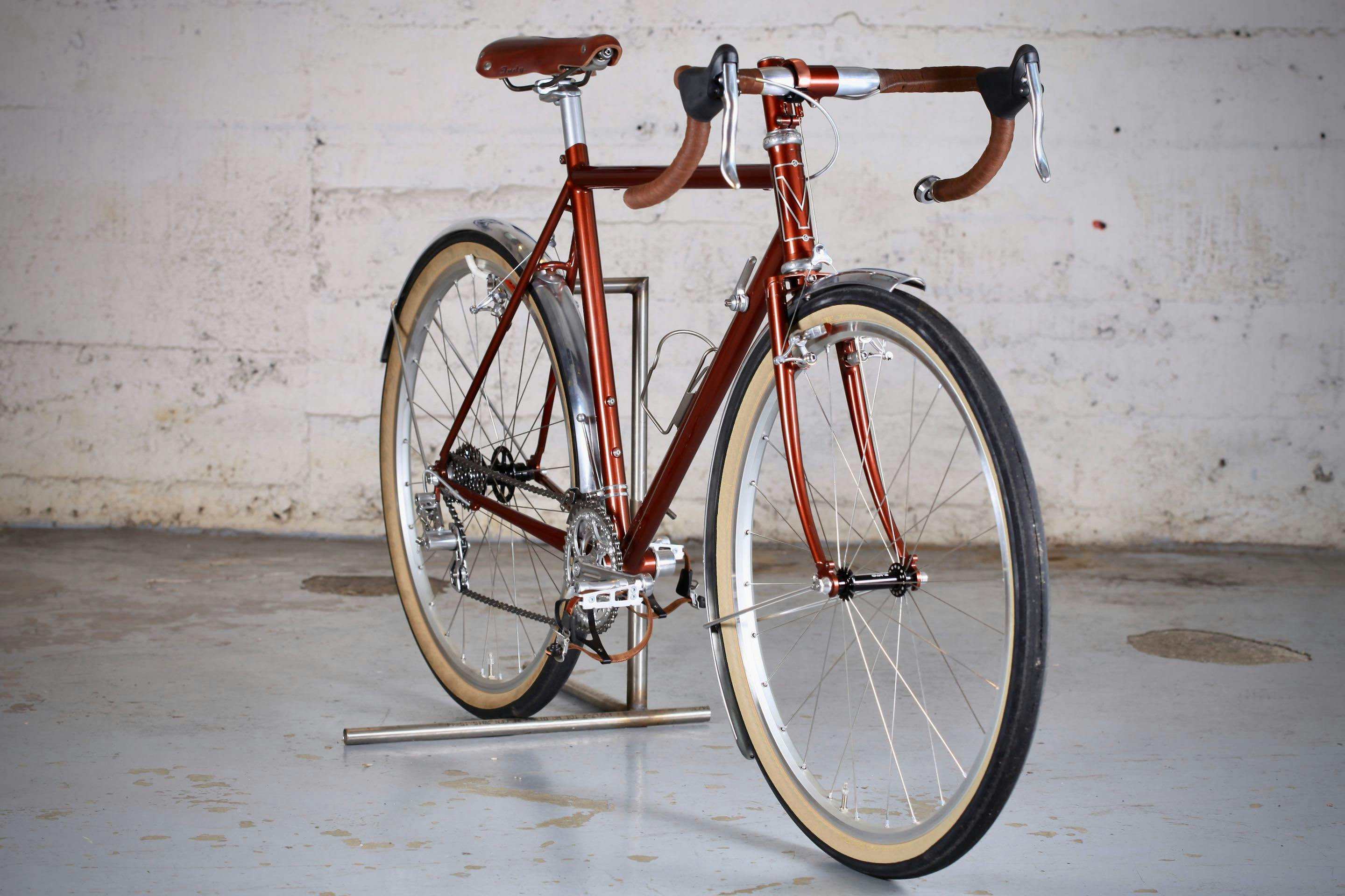Christophe est amoureux des réalisations françaises des années 30 à 50 et plus particulièrement des Routes et des Bourdel, deux cadreurs connus des initiés. Nous lui avons donc proposé un vélo à l'esthétique traditionnelle.
