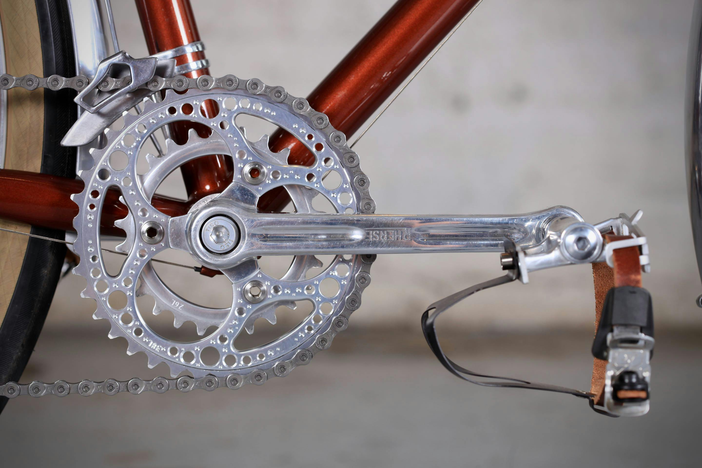 Le pédalier est un René Herse moderne passé à la perceuse par Christophe pour l'alléger et rappeler le pédalier du Motobécane de Luis Ocana.