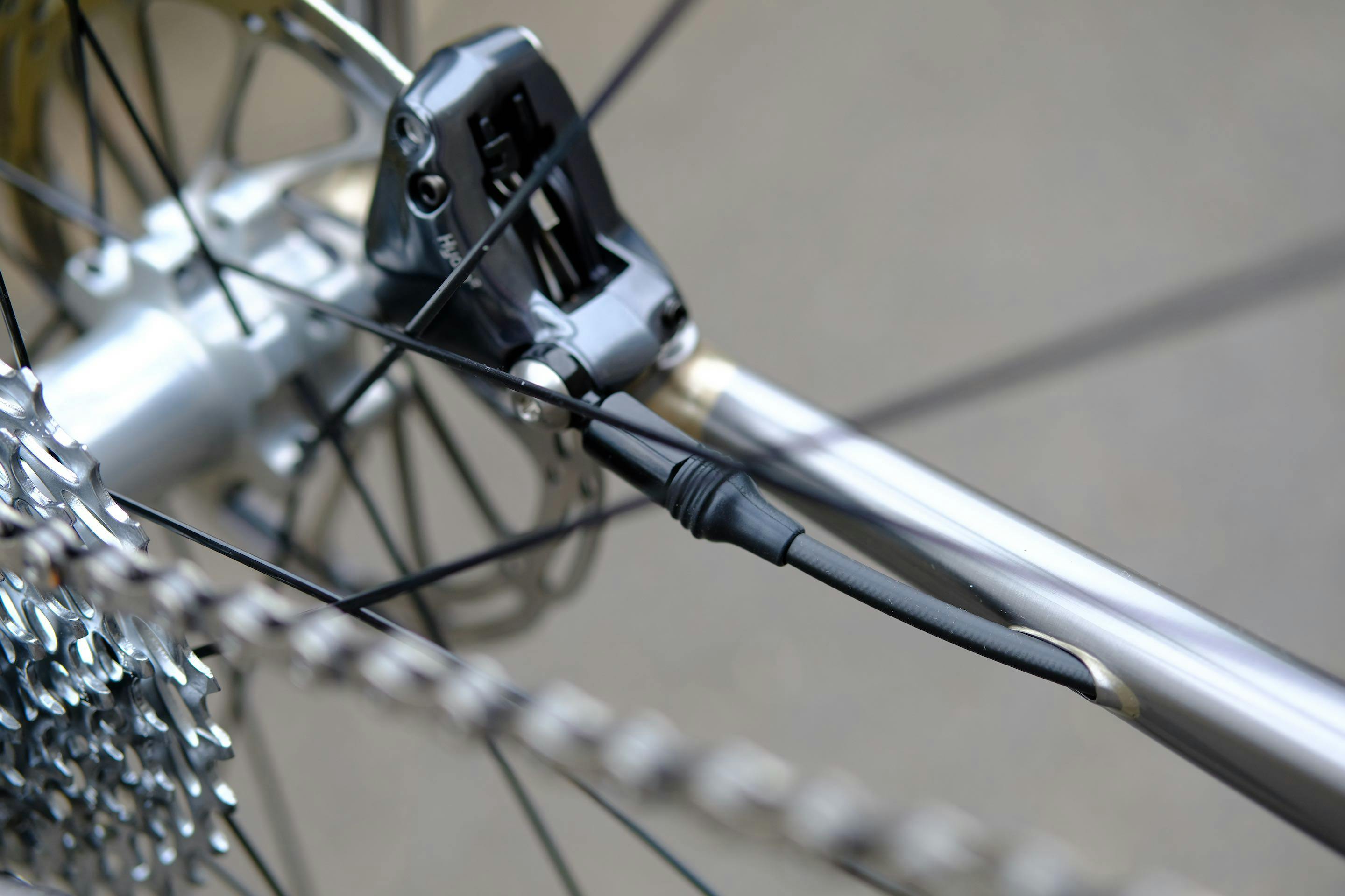 Une barrette en inox directement brasée sur la douille de direction permet de protéger la peinture du cadre des frottements des gaines. Cette option est disponible sur tous nos vélos sur-mesure.