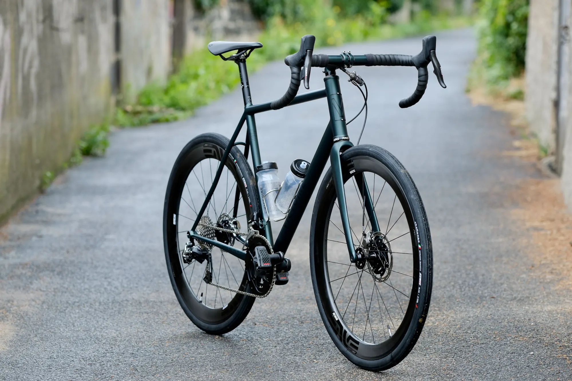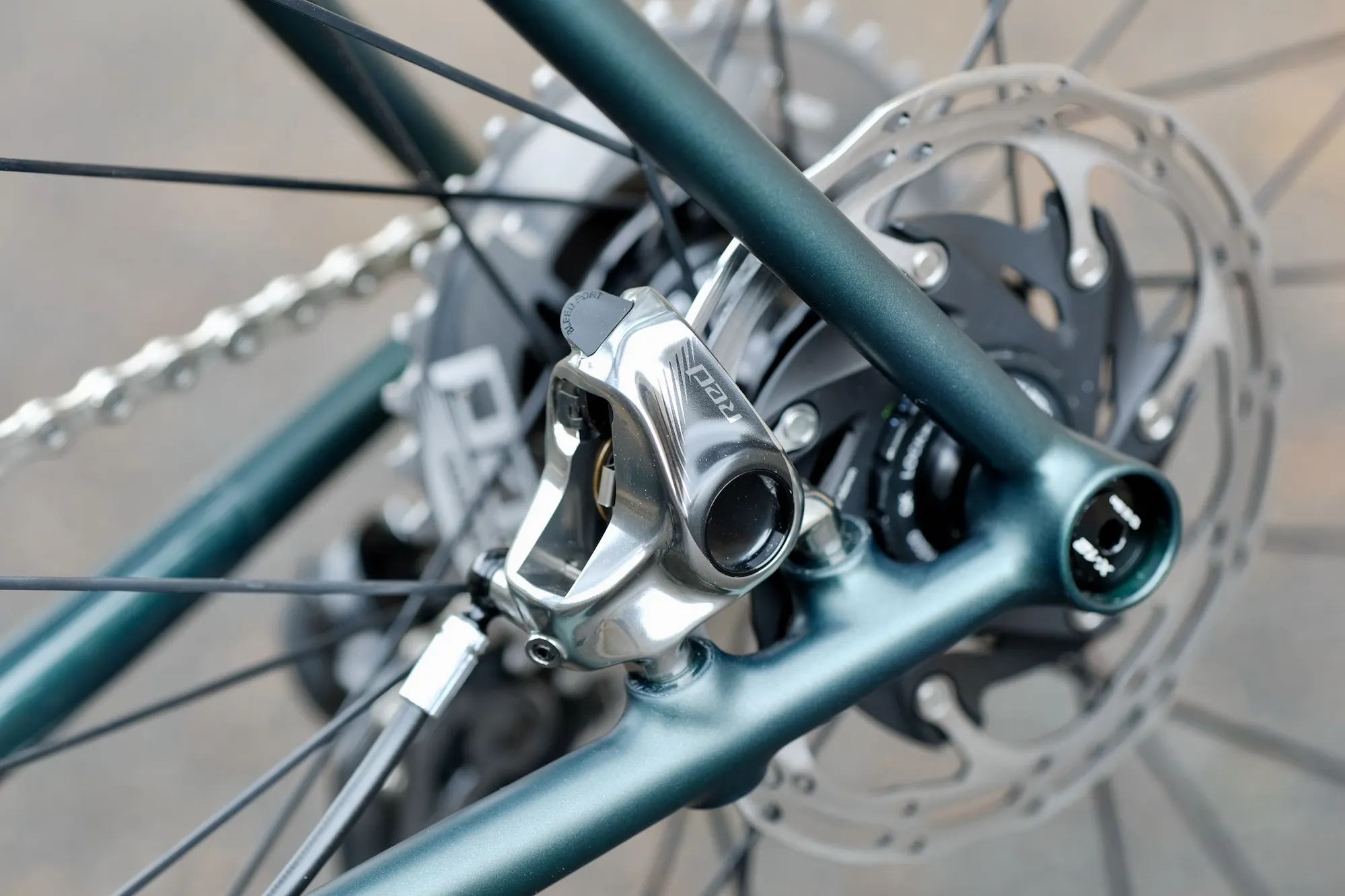 La polyvalence est apportée par le triangle arrière et la fourche en carbone Columbus Futura Gravel. Cette fourche, couplée aux bases et aux haubans cintrés permet un montage de pneus jusqu’à 700*38 mm et donc une grand polyvalence d’utilisation qui permettra à Valéry de s’égarer hors des sentiers battus.