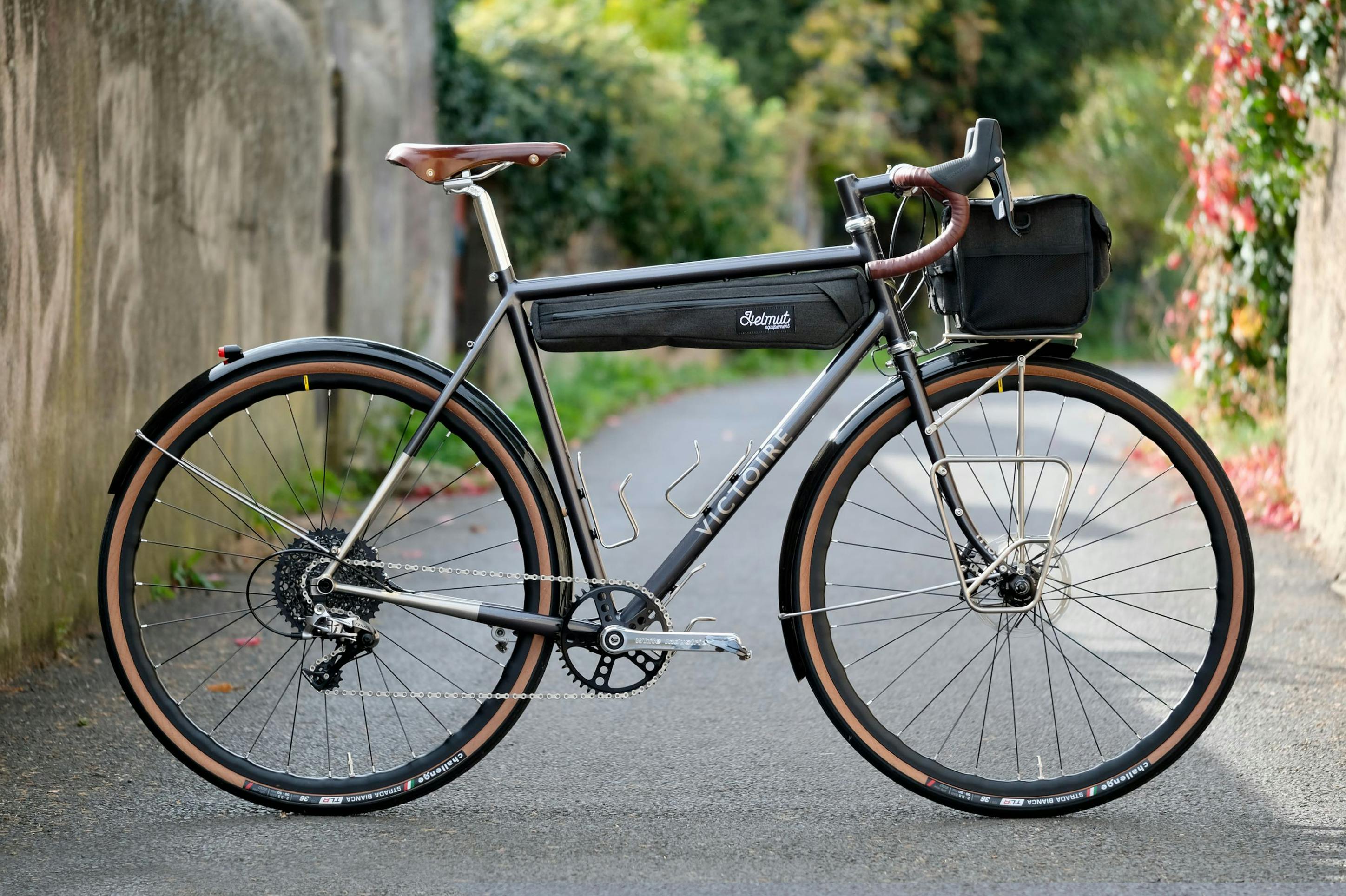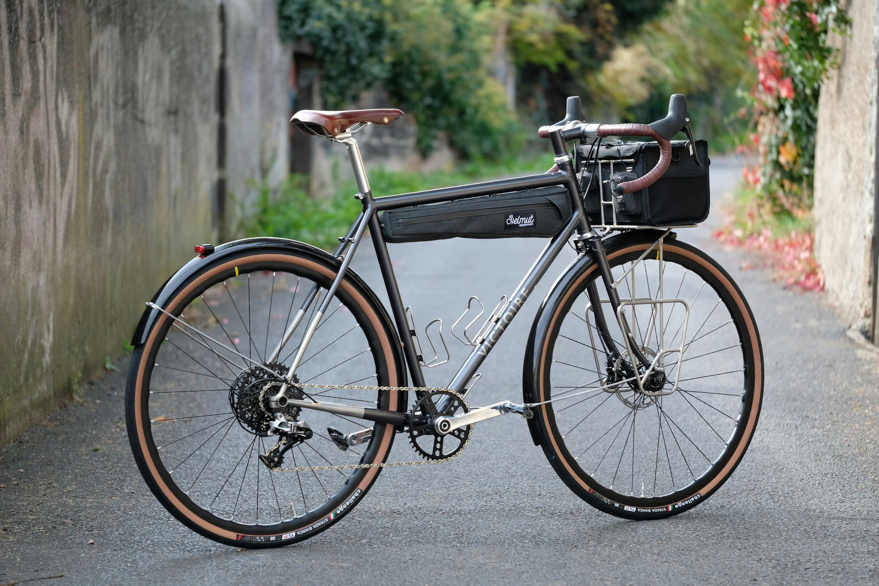 Cadre, fourche et potence ont tous trois été peints afin de créer un ensemble cohérent. Cet ensemble teintes neutres mettent en valeur la selle et la guidoline Berthoud ainsi que les pneus à flancs beiges. Ces équipements ajoutent une légère touche de couleur à l'ensemble tout en rappelant l'esthétique des randonneuses d'époque.