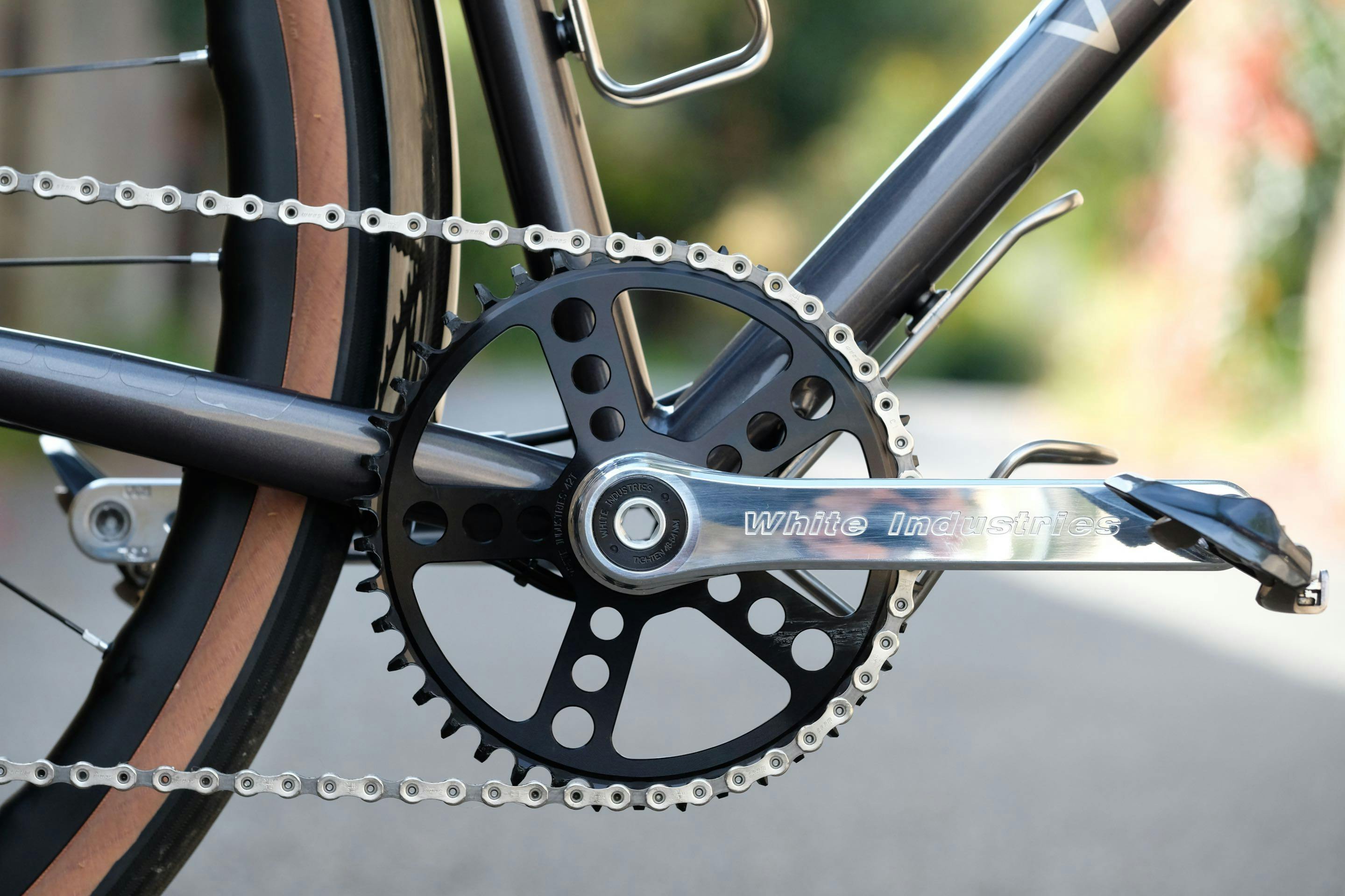 Le pédalier du Victoire n°490 est un White Industries, fabriqué en Californie. Il est monté avec un plateau de 42 dents du même fabricant.