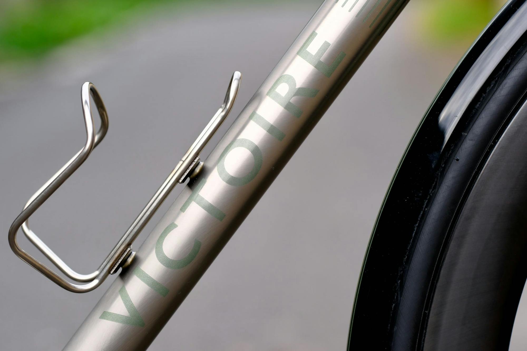 Max a peint le tube supérieur, le tube de direction, le haut du tube de selle et les haubans dans un vert métallisé, sobre et profond. Les garde-boues sont en carbone, peints en noir, avec deux fines bandes vertes qui reprennent la teinte du cadre. Le contraste avec l'inox brut du tube diagonal et des bases est discret mais lisible. Sur le tube de direction, le rameau Victoire doré, en relief. La potence Deda a été peinte en vert assorti, et la guidoline noire complète un ensemble volontairement sobre, à l'opposé du n°588 de Loïc, haut en couleur. La selle et la tige de selle Deda Elementi en carbone noir ont été choisies par Christophe pour ses longues heures en selle.
