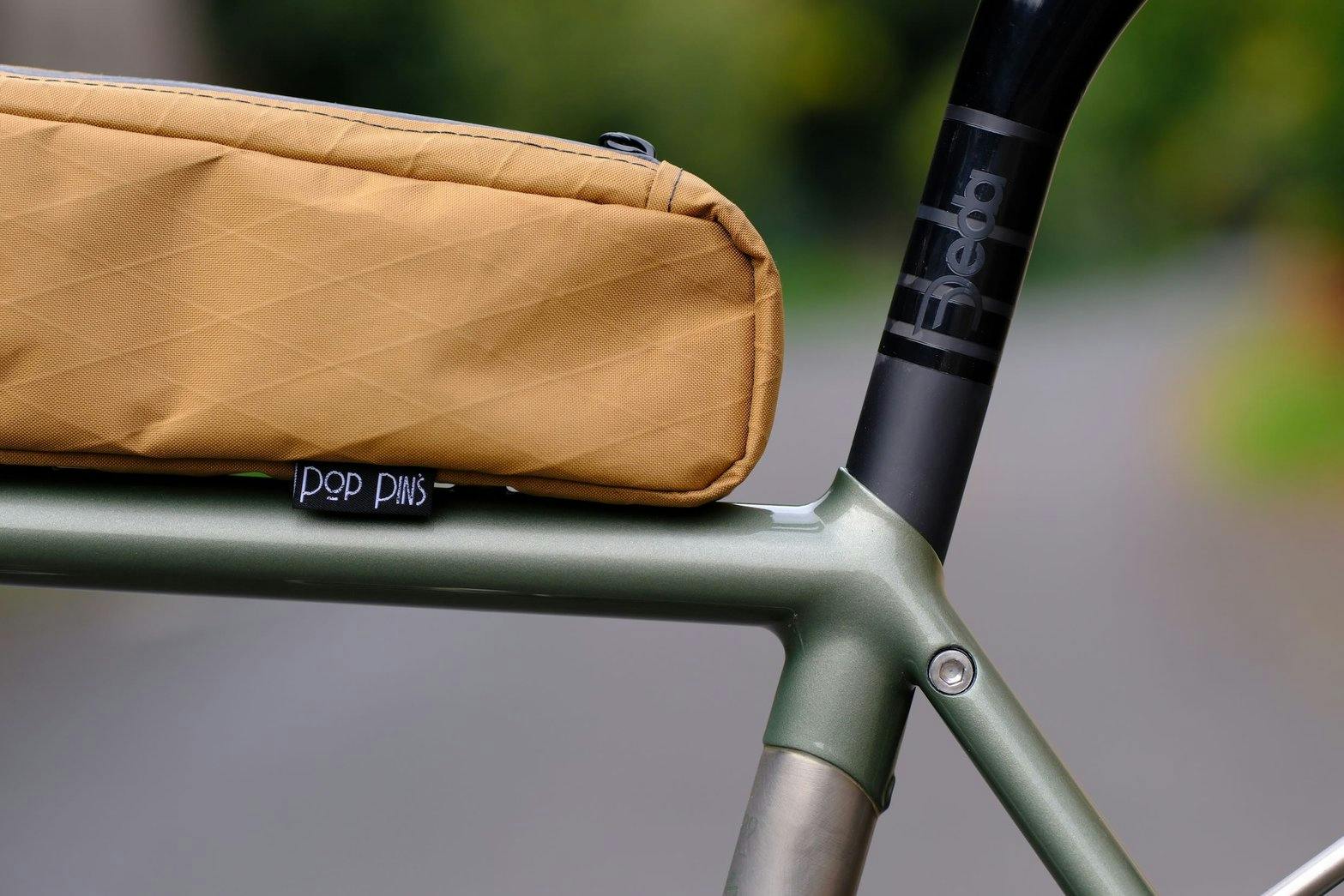 Les sacoches Pop Pin's reprennent le même gabarit que celles du n°588, mais dans un tissu X-Pac sable avec des cordons verts et une doublure intérieure orange, en accord avec la palette du vélo. La sacoche de tube supérieur court de la potence au collier de selle, ouverte par le dessus. La sacoche arrière se clipse sur le porte-bagages via le système Rouge mécanique de chez Jolie Rouge. Le sable dialogue avec le vert métallisé et l'inox brossé, un choix plus discret que les sacoches blanches de Loïc.