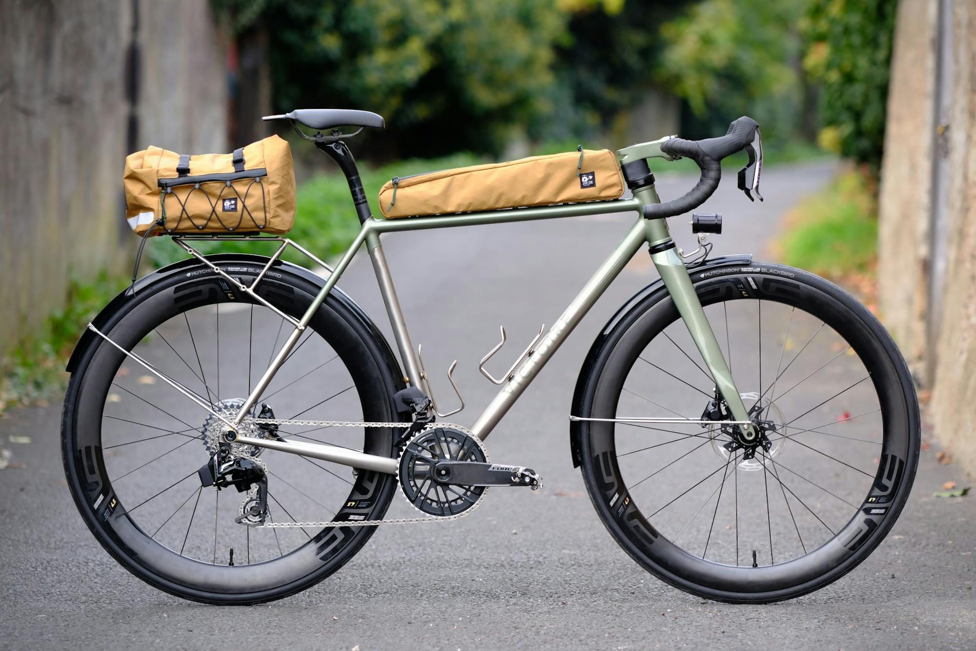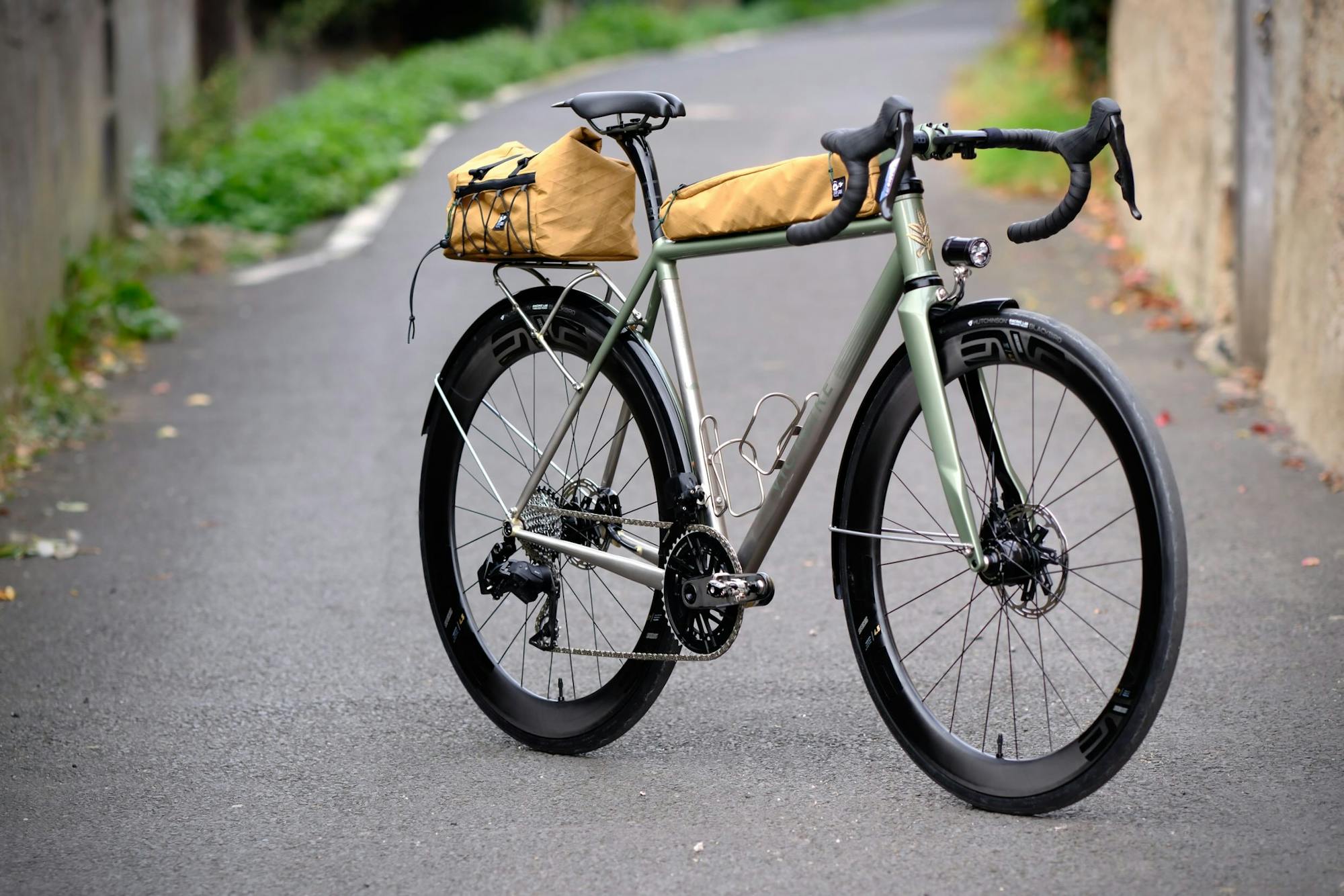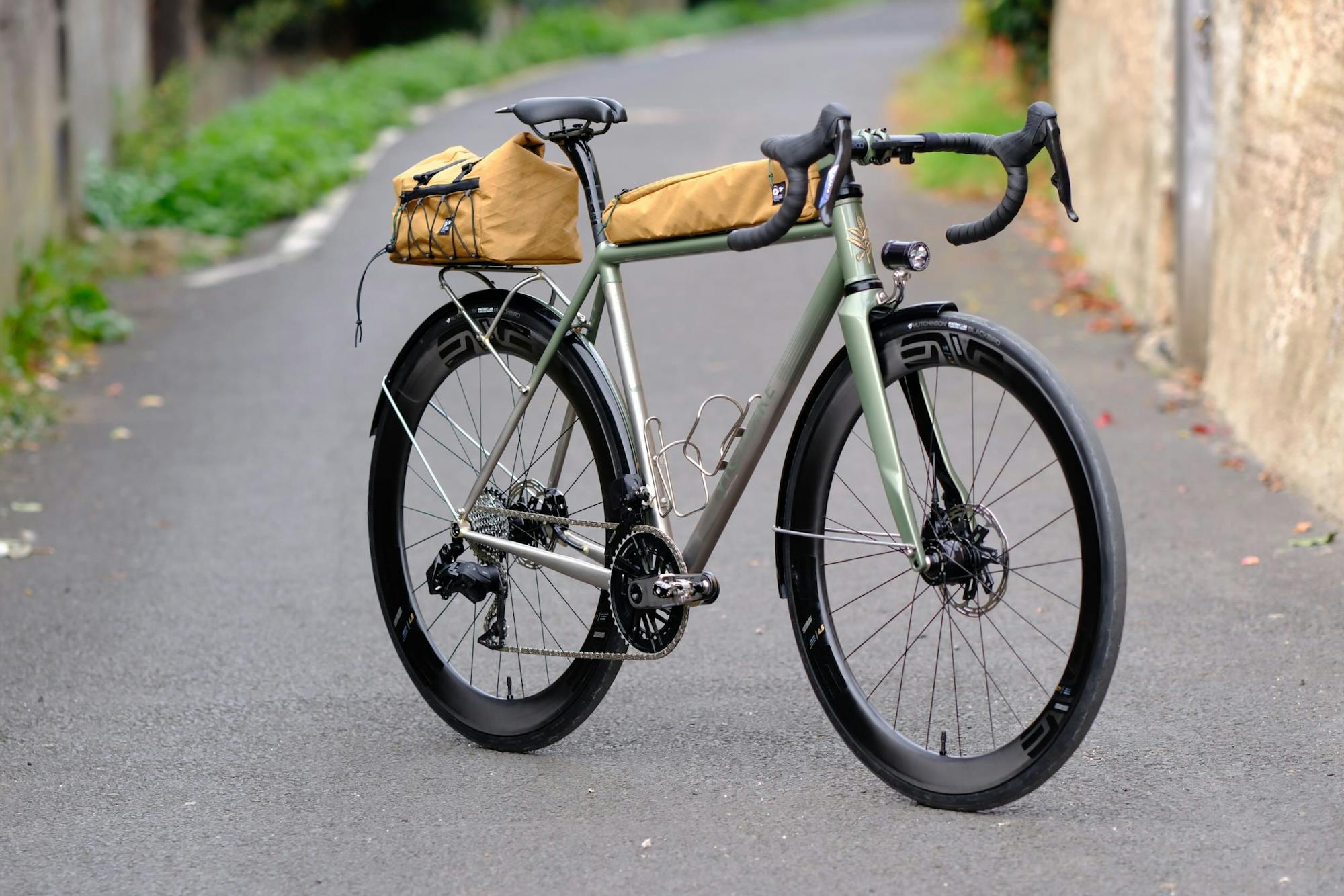 Le cahier des charges de Christophe partait de la même base que celui de son frère : un cadre inox nerveux, des roues carbone, une transmission électronique, et une intégration propre des bagages et de l'éclairage dynamo. Mais là où Loïc voulait de la couleur, Christophe cherchait la discrétion. Le vert Aston Martin métallisé qui habille une partie du cadre donne le ton : sobre, profond, presque anglais. Le reste suit cette logique : guidoline noire, composants noirs, sacoches sable. Un vélo qui ne cherche pas à se faire remarquer.