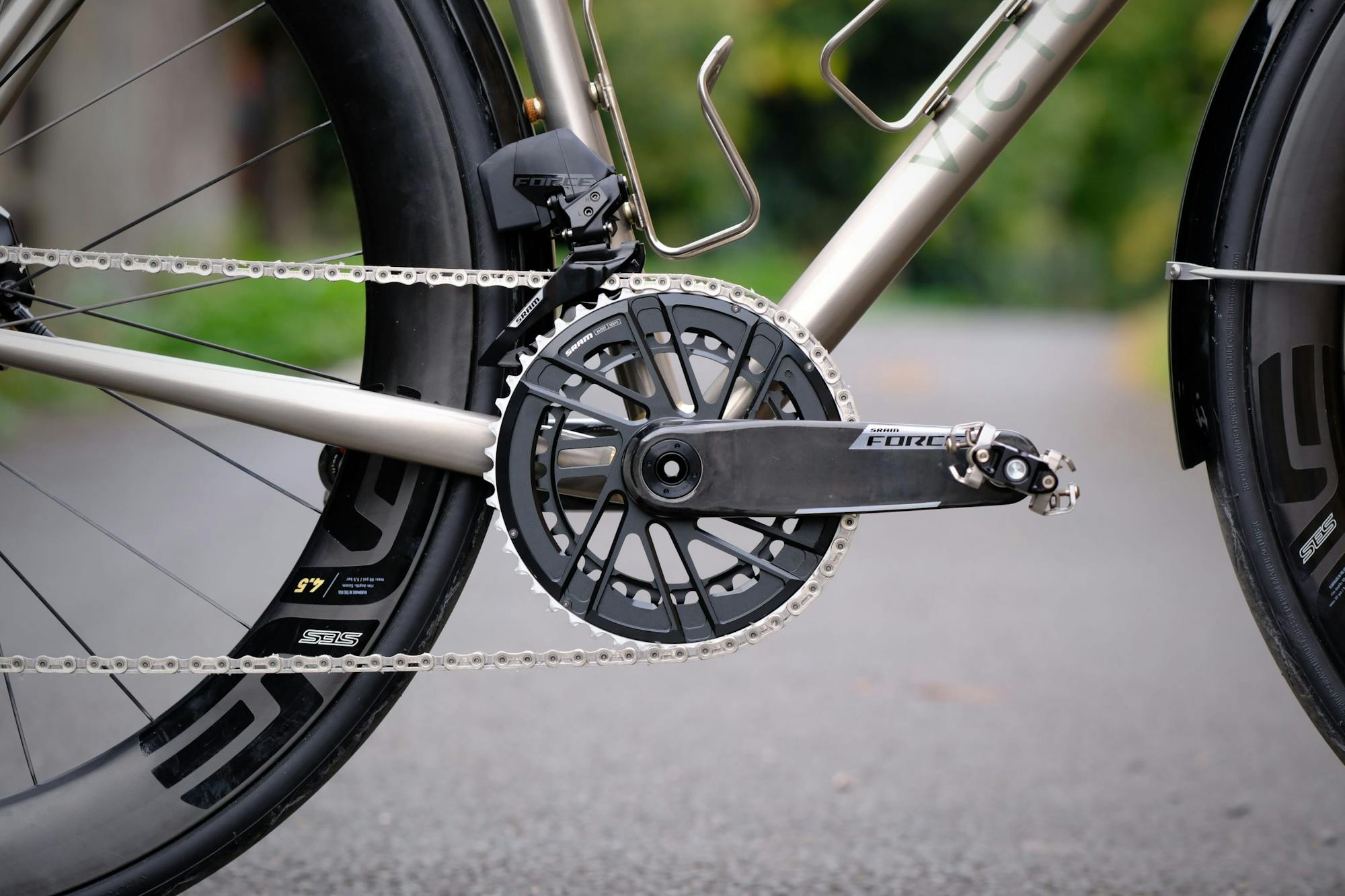 Les deux frères roulent avec le même groupe SRAM Force AXS électronique sans fil, double plateau, avec capteur de puissance au pédalier. L'absence de câbles simplifie l'intégration et l'entretien sur un vélo de longue distance. Le boîtier de pédalier Chris King ThreadFit est en noir, comme l'ensemble des composants. Les freins à disque hydrauliques SRAM Force avec disques Centerline XR complètent le montage.