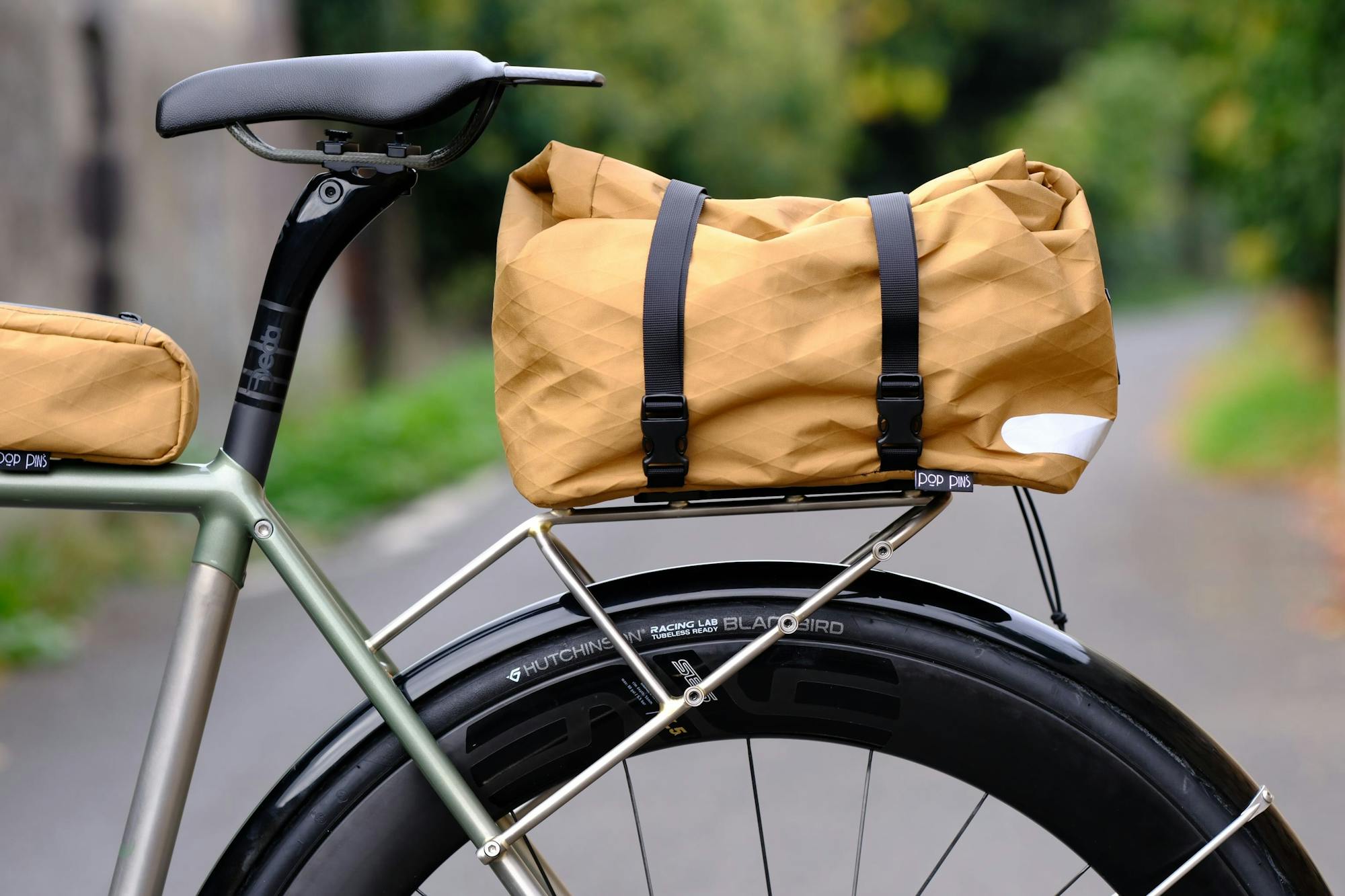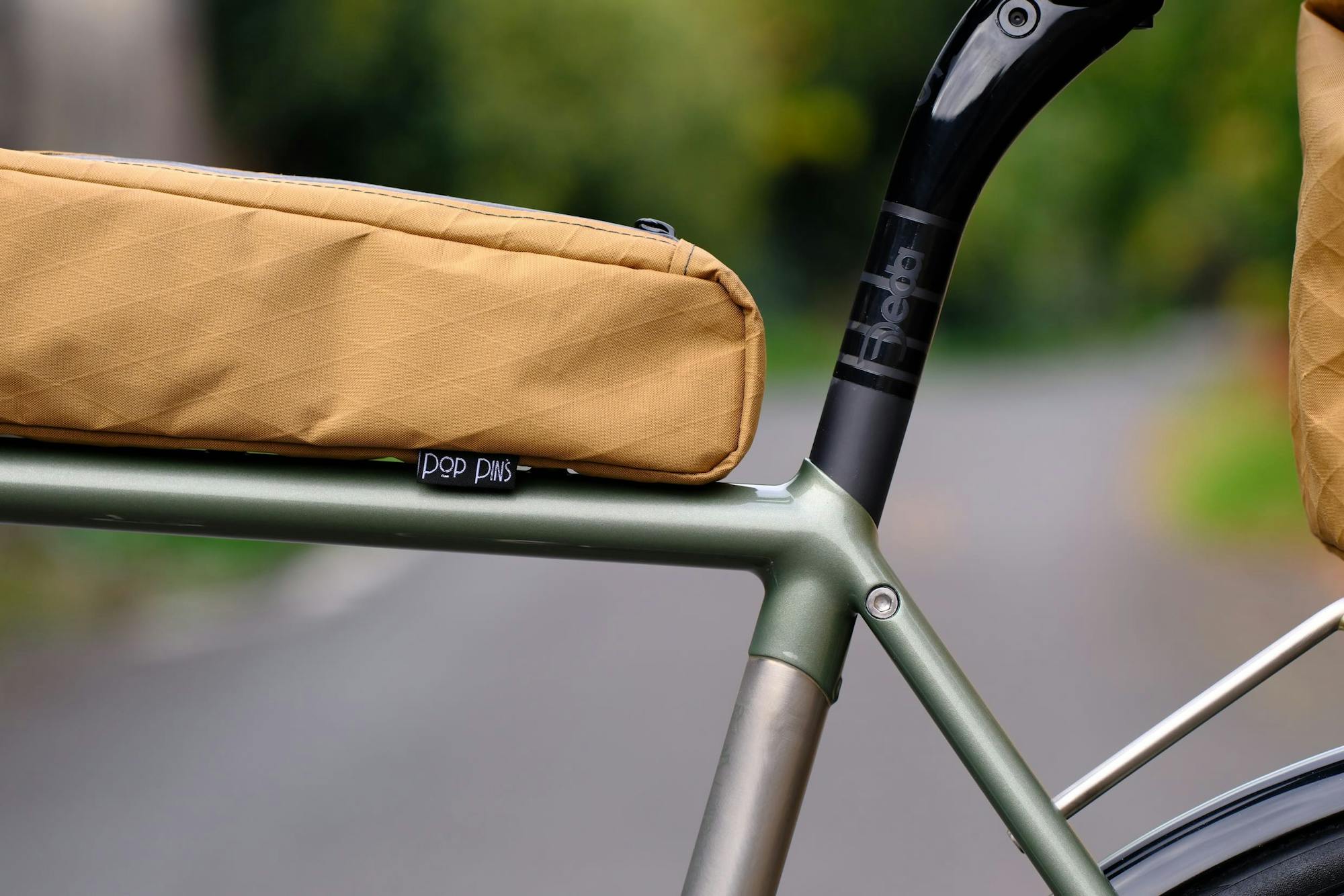 Les sacoches Pop Pin's reprennent le même gabarit que celles du n°588, mais dans un tissu X-Pac sable avec des cordons verts et une doublure intérieure orange, en accord avec la palette du vélo. La sacoche de tube supérieur court de la potence au collier de selle, ouverte par le dessus. La sacoche arrière se clipse sur le porte-bagages via le système Rouge mécanique de chez Jolie Rouge. Le sable dialogue avec le vert métallisé et l'inox brossé, un choix plus discret que les sacoches blanches de Loïc.