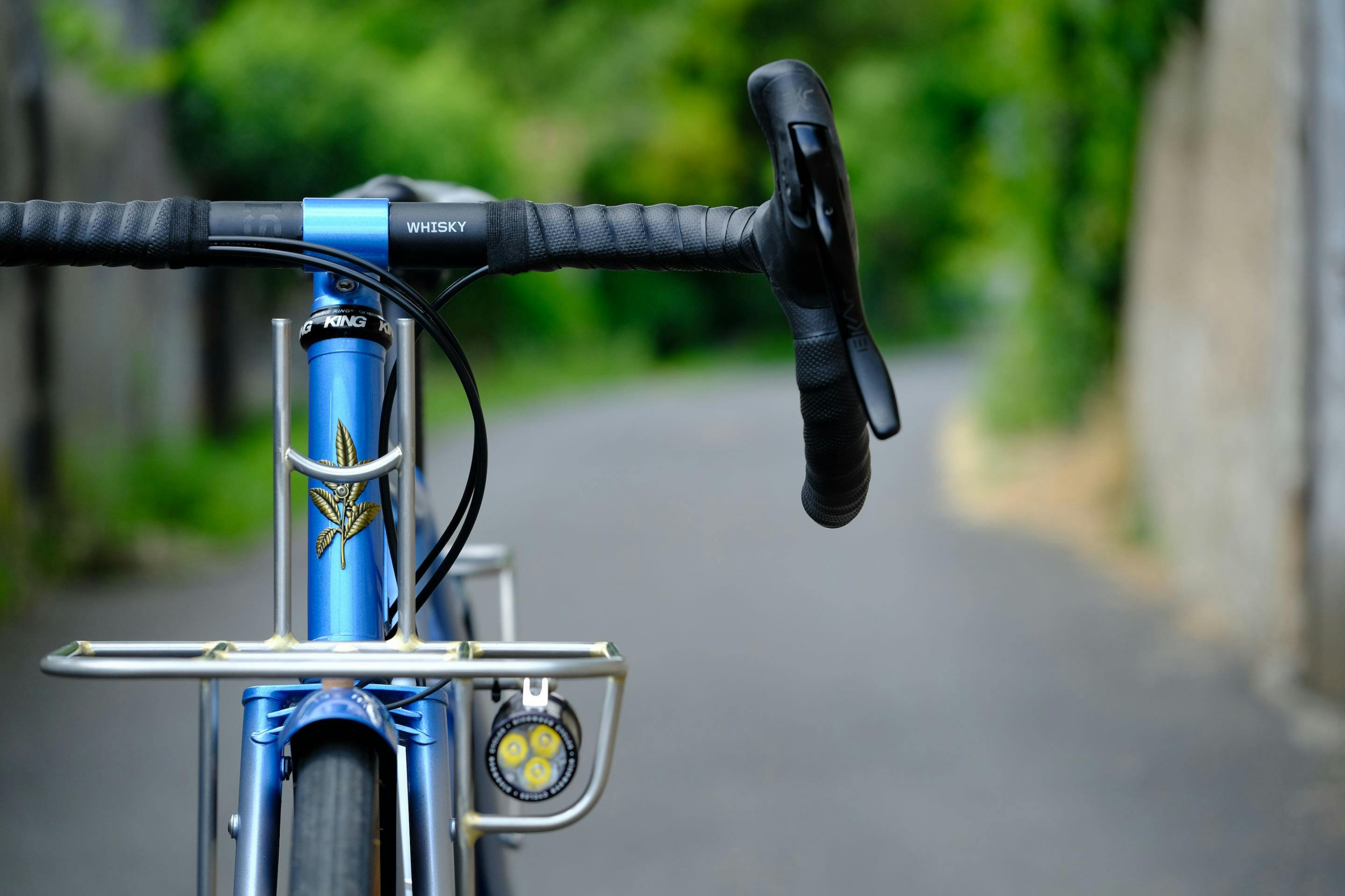 Comme pour la majorité de nos randonneuses, la fourche, la potence et les porte paquets du Victoire de Fabien ont été réalisés dans notre atelier. Ils apportent une esthétique traditionnelle à ce vélo, pourtant équipés de composants modernes : un monoplateau, un freinage à disques ainsi que des garde-boues en carbone.