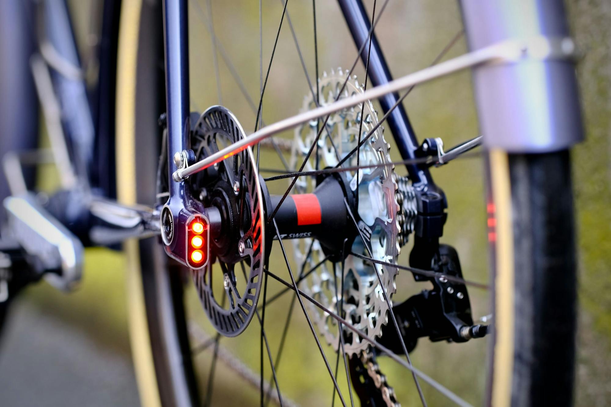 La dynamo alimente les deux lampes. En plus de la lumière arrière intégrée au cadre, François sera éclairé à l'avant et pourra recharger téléphone et GPS sur la Sinewave Beacon, positionnée sous le porte-bagage avant.