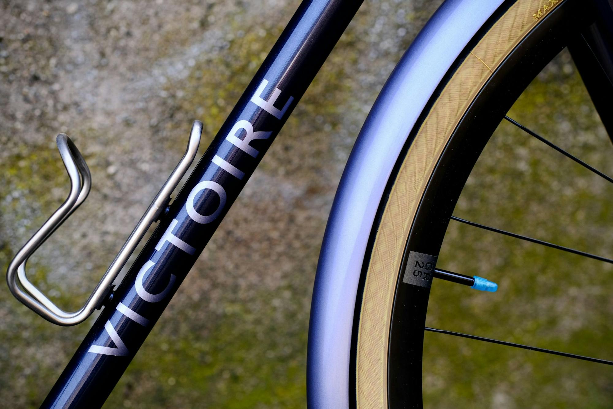 Les garde-boues font aussi la part belle à la modernité : ils sont en carbone, et ont été peint avec l'exact même bleu que le logo Victoire du tube diagonal. Ce détail permet de garder une esthétique cohérente sur l'ensemble du vélo.