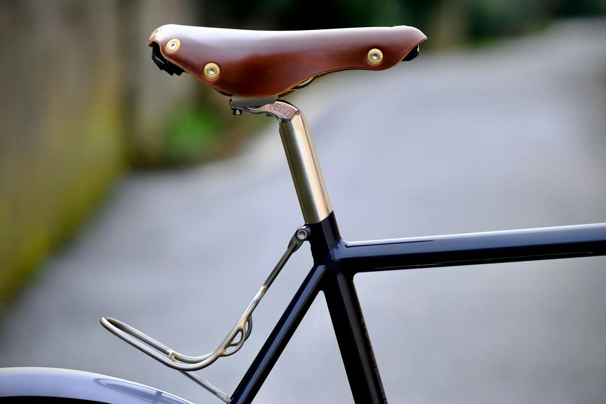 Nous avons sélectionné une selle Berthoud, fabriquant historique de selles de randonneuse à Mâcon. Pour respecter l'aspect vintage, la tige de selle provient de chez Paul : moderne, mais avec un look classique.