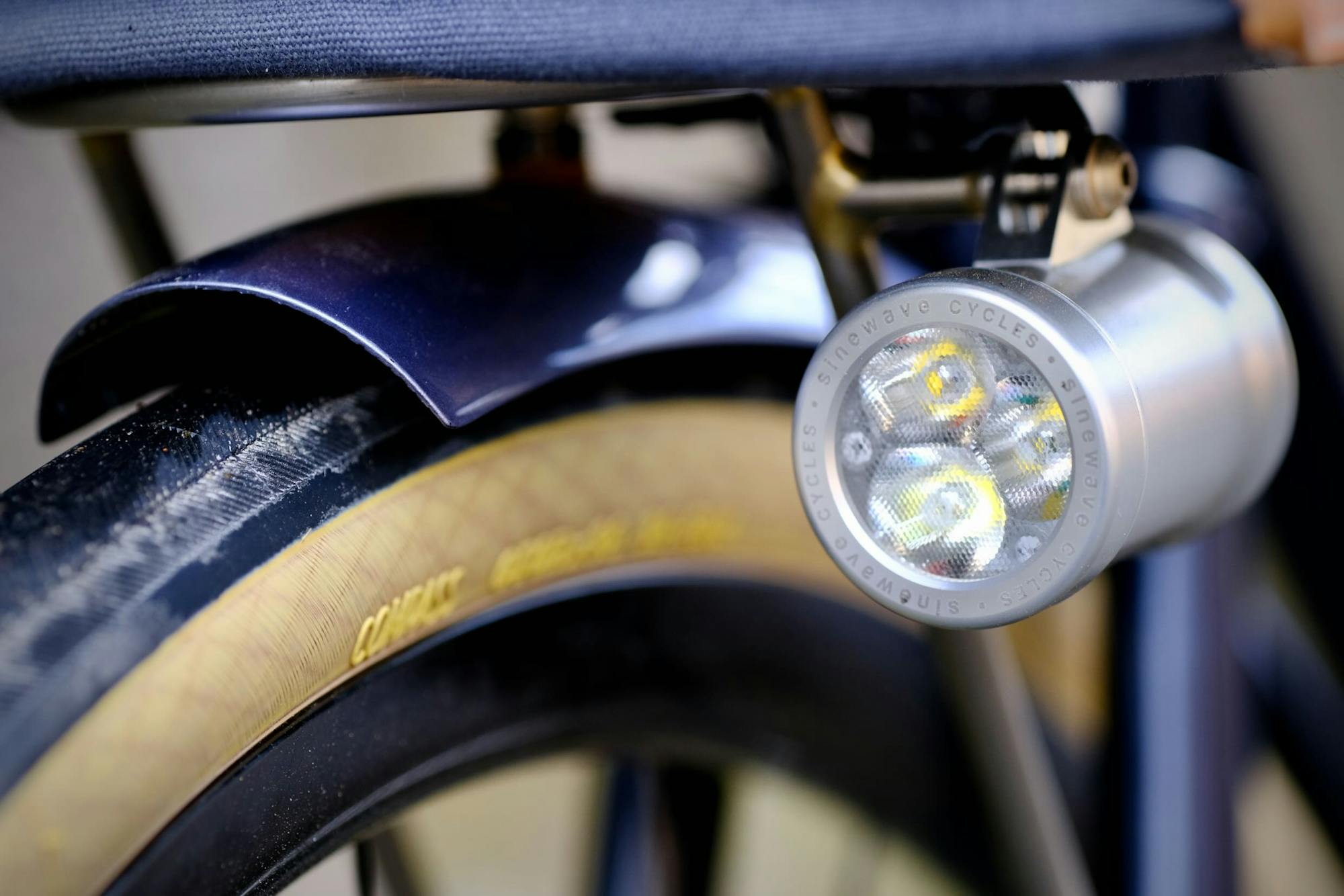 La dynamo alimente les deux lampes. En plus de la lumière arrière intégrée au cadre, François sera éclairé à l'avant et pourra recharger téléphone et GPS sur la Sinewave Beacon, positionnée sous le porte-bagage avant.