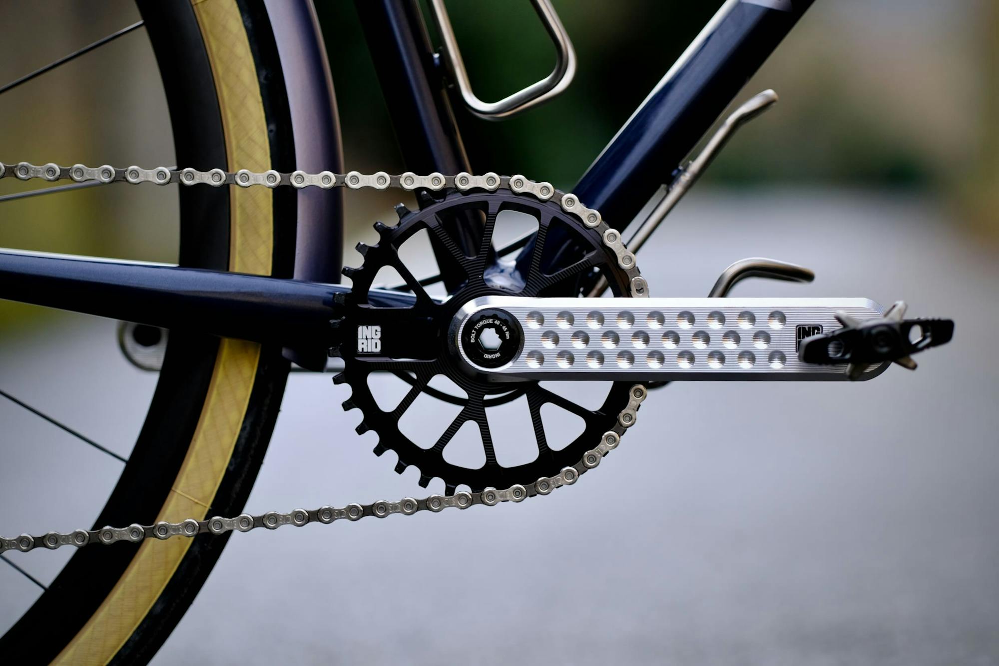 Le jeu de direction provient de chez White Industries. Nous l'avons ici préféré au Chris King qui équipe beaucoup de nos vélos pour sa finesse, qui se marie mieux avec l'esthétique décidément classique de la monture de François. Pour le pédalier, c'est aussi le choix de la modernité qui s'est imposé, avec le magnifique CRS-POP de chez Ingrid, plus cohérent visuellement que les larges manivelles en carbone de chez Campagnolo.