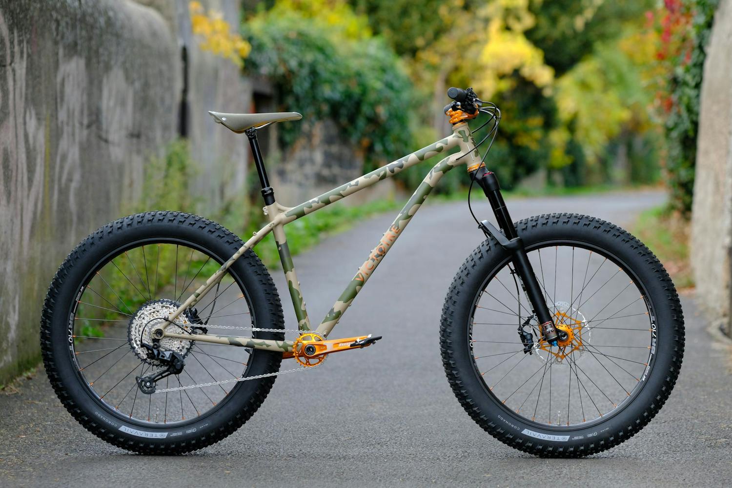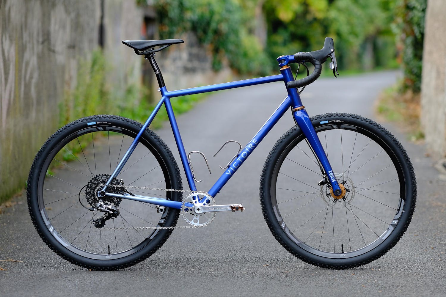 Les roues du Victoire n°482 ont été rayonnées à l'atelier par Olivier. Les jantes sont des Dually 27,5" toutes deux fournies par Velocity, fournisseur américain. Les rayons, eux, sont belges et proviennent de Sapim. Ces roues, le cadre et la fourche permettent la chausse de pneus aux dimensions imposantes : Ce sont des Teravail coronado en 27.5 par 3.0 qui assurent confort et grip à Olivier pour ses sorties sur chemins.